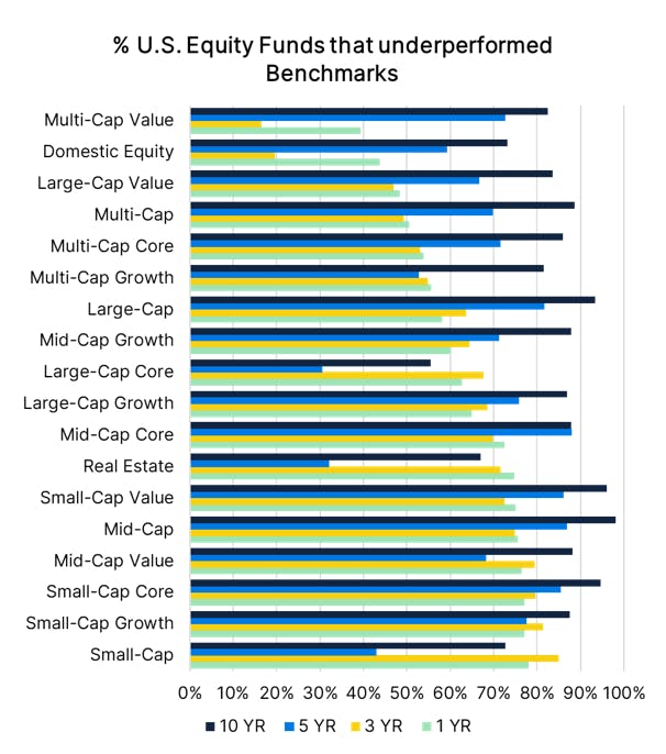 Based on June 30th, 2021 SPIVA data, actively managed funds failed to take investors to the promised land after underperforming their benchmarks. For example, 58%, 67%, 73%, and 82% of Large-Cap U.S. Equity funds have failed to outperform the S&P 500 over 1YR, 3YR, 5YR, and 10YR periods respectively.