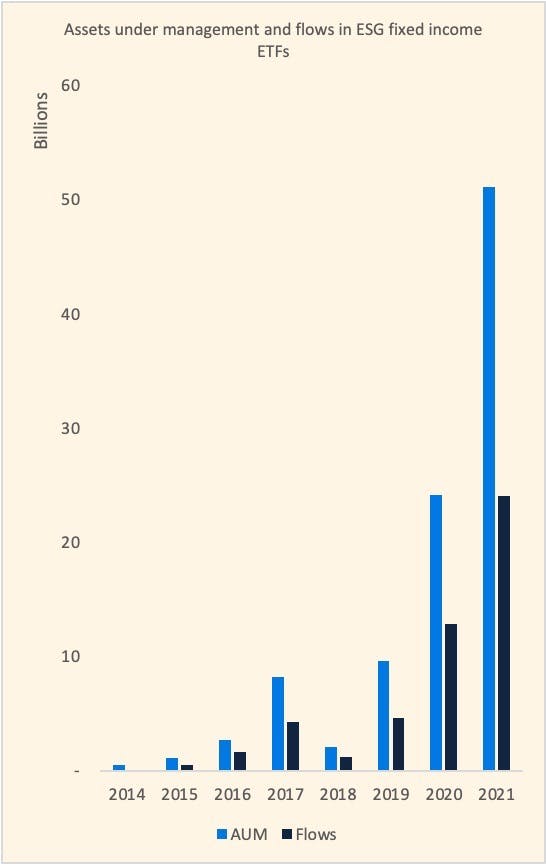 ESG Fixed Income ETFs for instance, are items in high demand on the portfolio menu. Since 2016, ESG Fixed Income ETFs assets under management (AuM) have grown 17-fold. This year, investors took it to another level, injecting $24.1 billion of additional capital into these products, almost double compared to the previous year’s total of $12.9 billion (+87%).