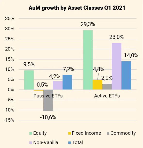 Active ETFs grew especially rapidly over the period. Worldwide and for all asset classes, they outgrew passive trackers by a factor of two. Commodity ETFs, especially gold, saw a net decrease of their assets in Q1 2021.