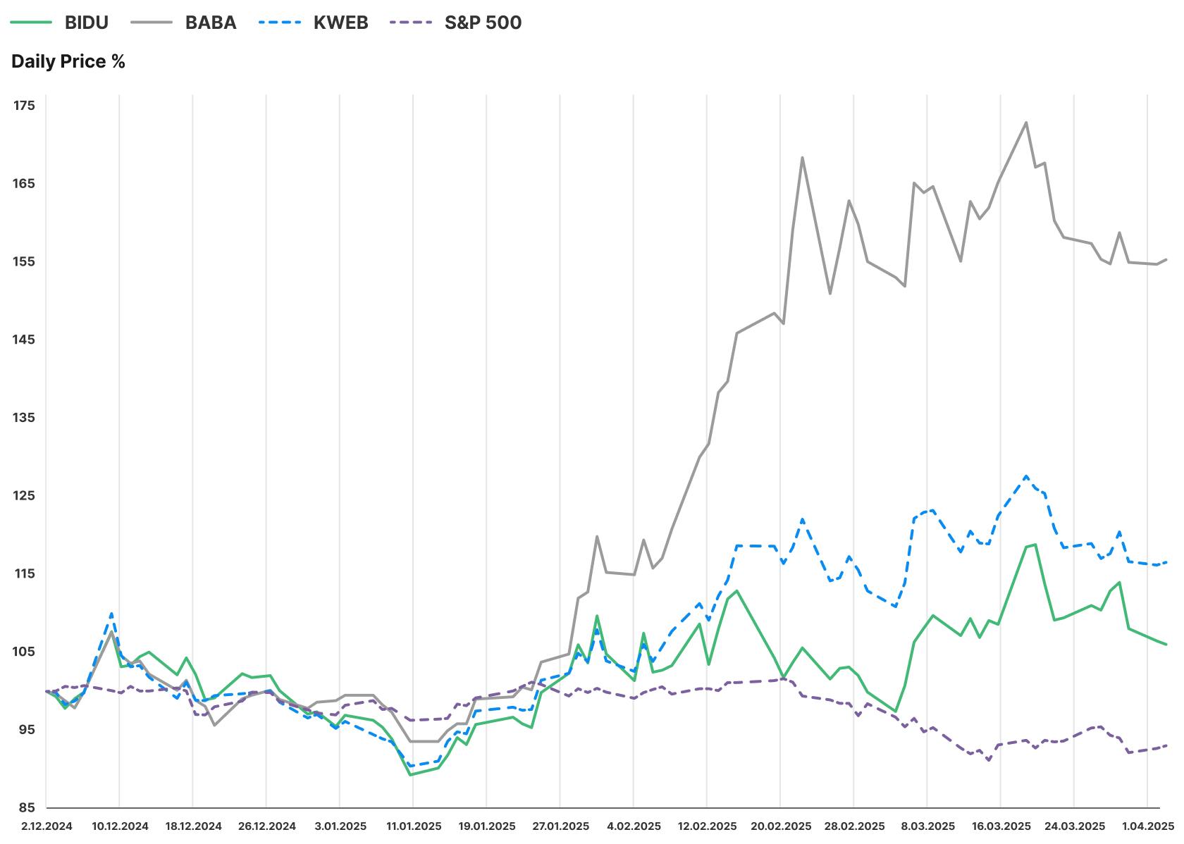 While Alibaba has been an outperformer against the average of its Chinese peers through much of the current year, Baidu has only begun to show signs of outperformance versus the average in the month of March. It also bears noting that the broad U.S. market as represented by the S&P 500 has been a substantial underperformer against Baidu, Alibaba as well as the average of China's leading tech companies.