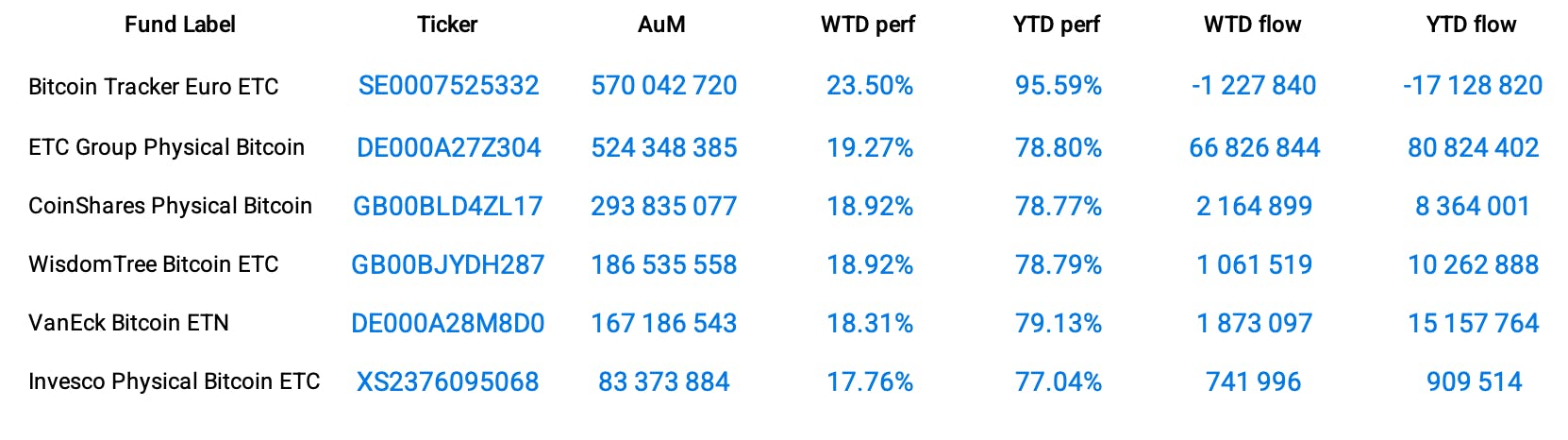 Fidelity Physical Bitcoin ETP (FBTC): Trading on exchanges across Europe, FBTC aims to track the price of Bitcoin and is 100% physically backed by Bitcoin held in custody provided by Fidelity Digital Assets. AUM currently stands at €7.03 M with a management fee of 0.75%.