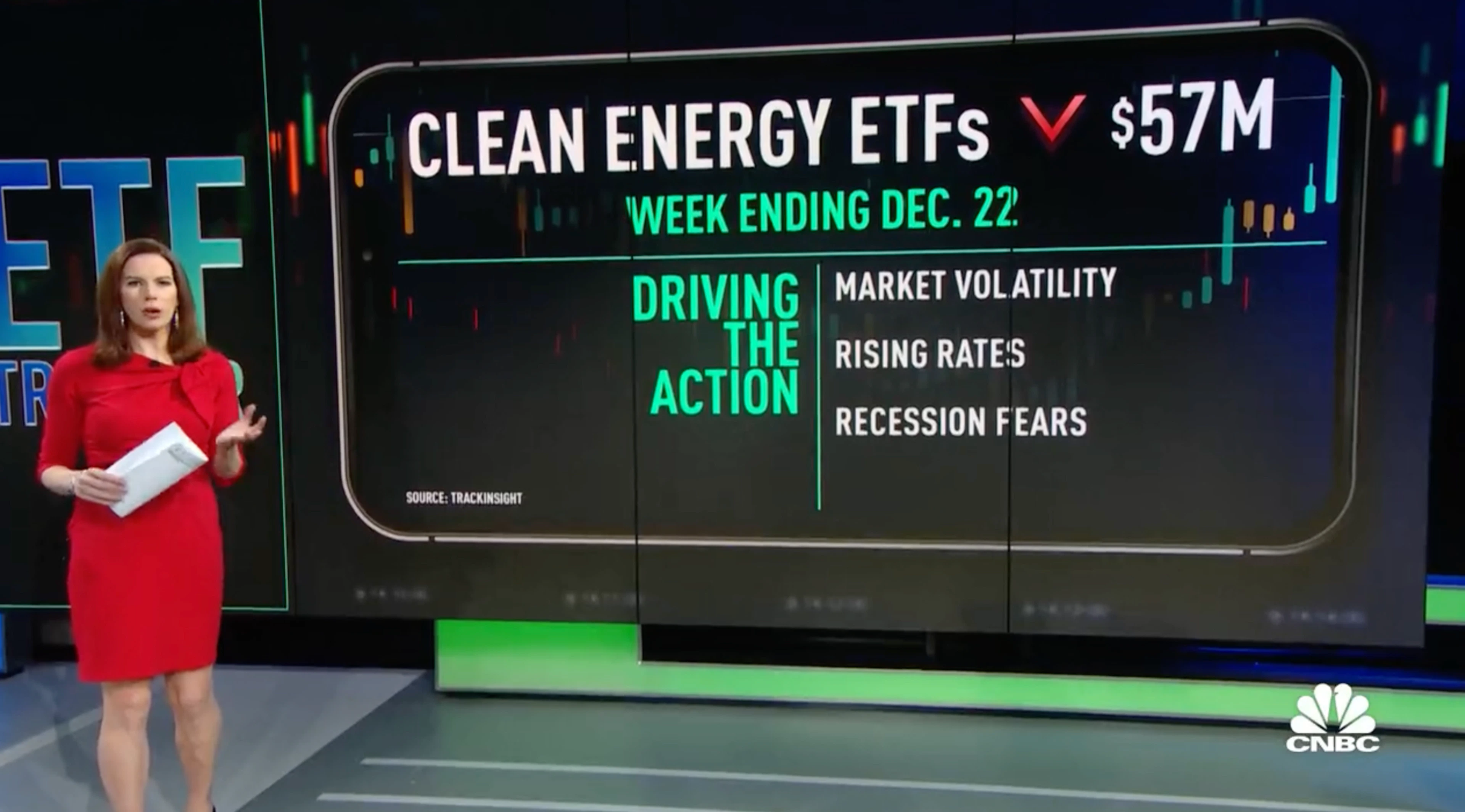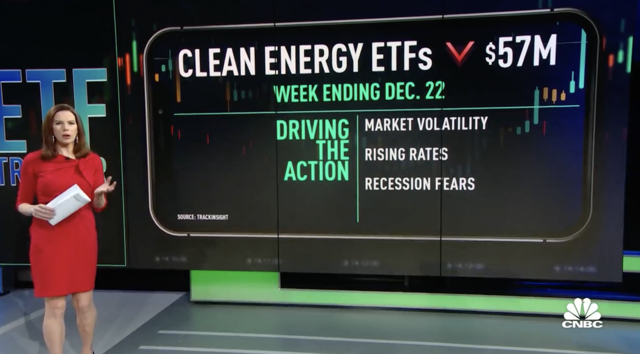 Clean energy ETFs seeing more than $50m in outflows, as rates, recession fears, and energy volatility hit investor sentiment with the Invesco Solar TAN ETF down more than 4%.