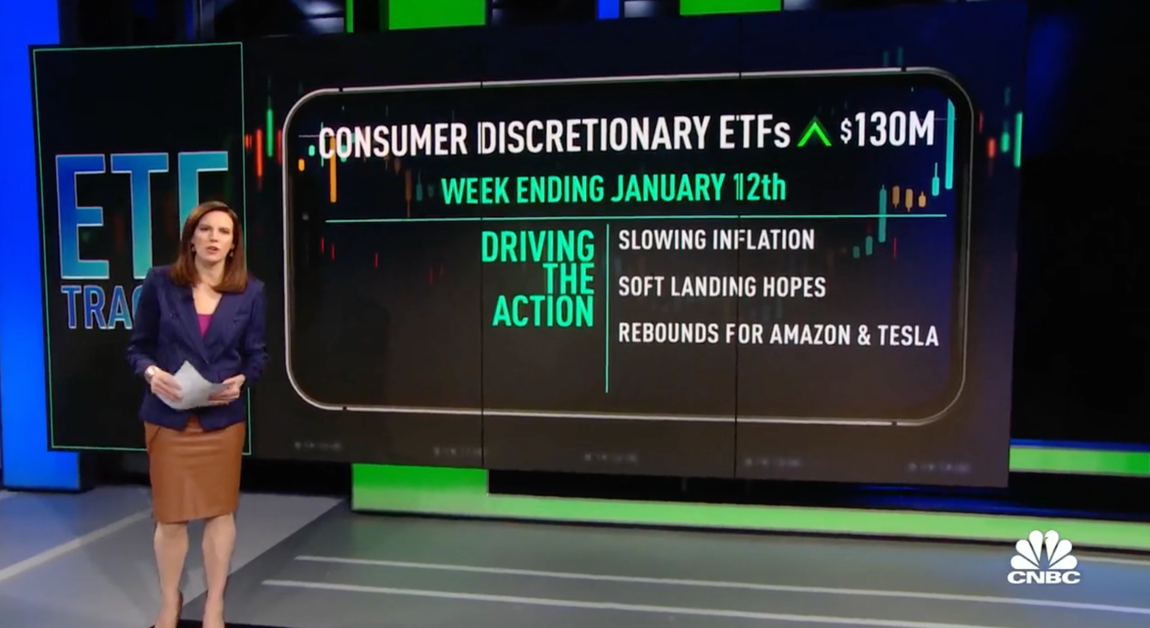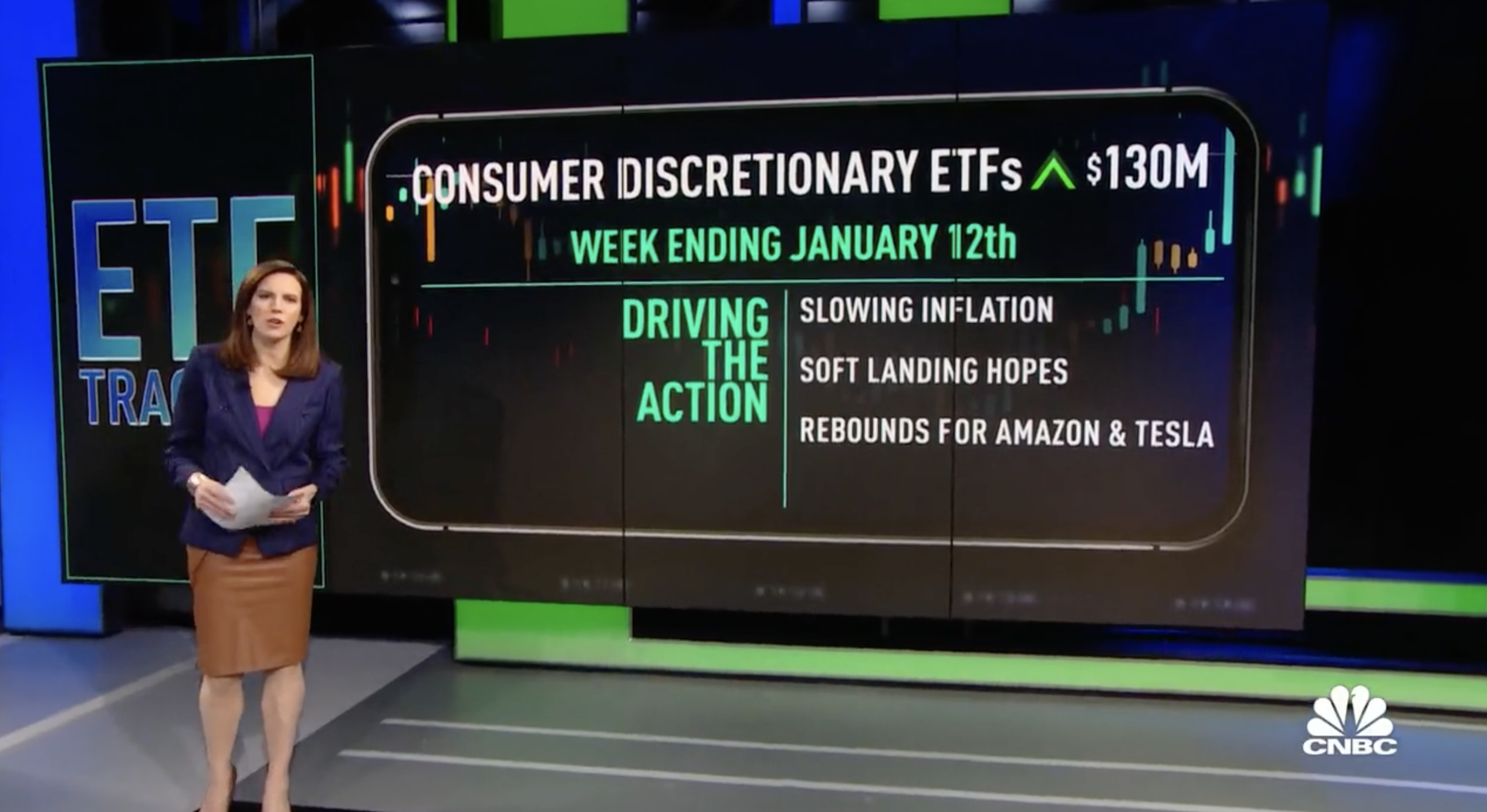 This week we're looking into consumer discretionary ETFs, $130 million of inflows coming in, in the weekend. And yesterday, that CPI report, showing inflation starting to slow and it could be a big boost for this group. A lot of them are techy kind of names. Soft landing hopes that would be good for everybody. And as a practical matter, Amazon up 14% this week. Tesla also gaining those are holdings, big holdings for these funds. So let's take a look at some of the specific ETFs we are talking about. The sector, SPDR up almost 5.5% percent. Vanguard's Consumer Fund up almost 6%, same for the Fidelity.