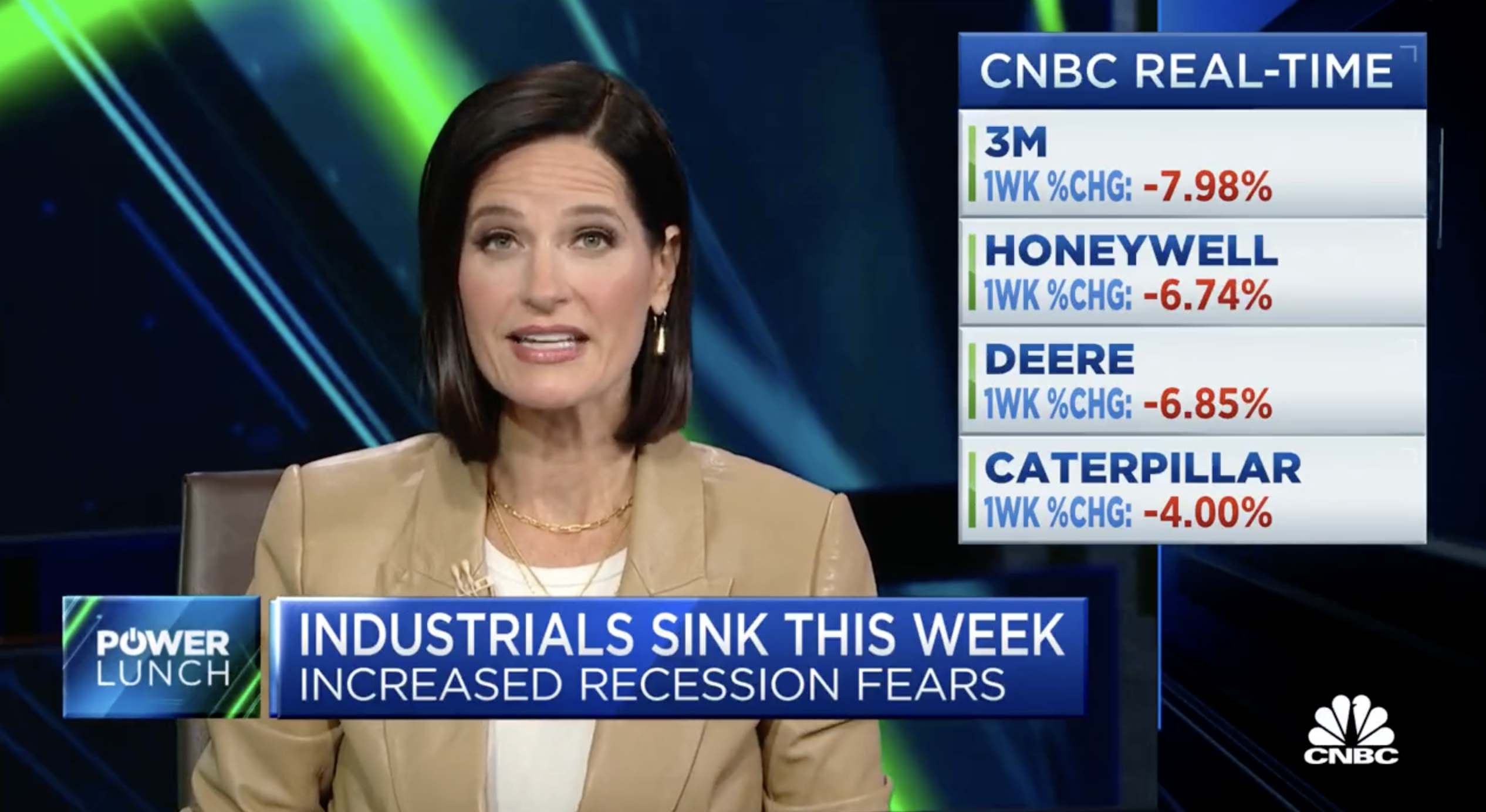 It is time now for our weekly ETF tracker. And this week we're looking at industrials. Those funds seeing outflows of $300 million this week according to our partners at Trackinsight. Now, some of the big stocks in the group are getting hit hard this week. We saw a big drop in industrial production leading to increased recession fear. So you've got Honeywell, 3M, Deere and Caterpillar all down this week. I'm looking at Deere right now, Down almost 7%.