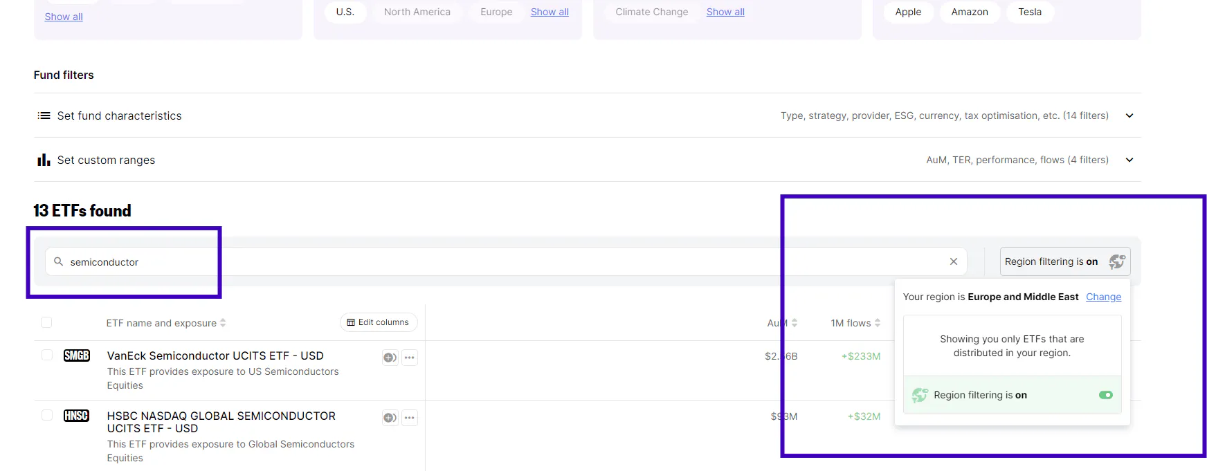 To explore more semiconductor ETFs available in Europe, apply the region filter and type "semiconductor" in the search box as seen in the image below.
