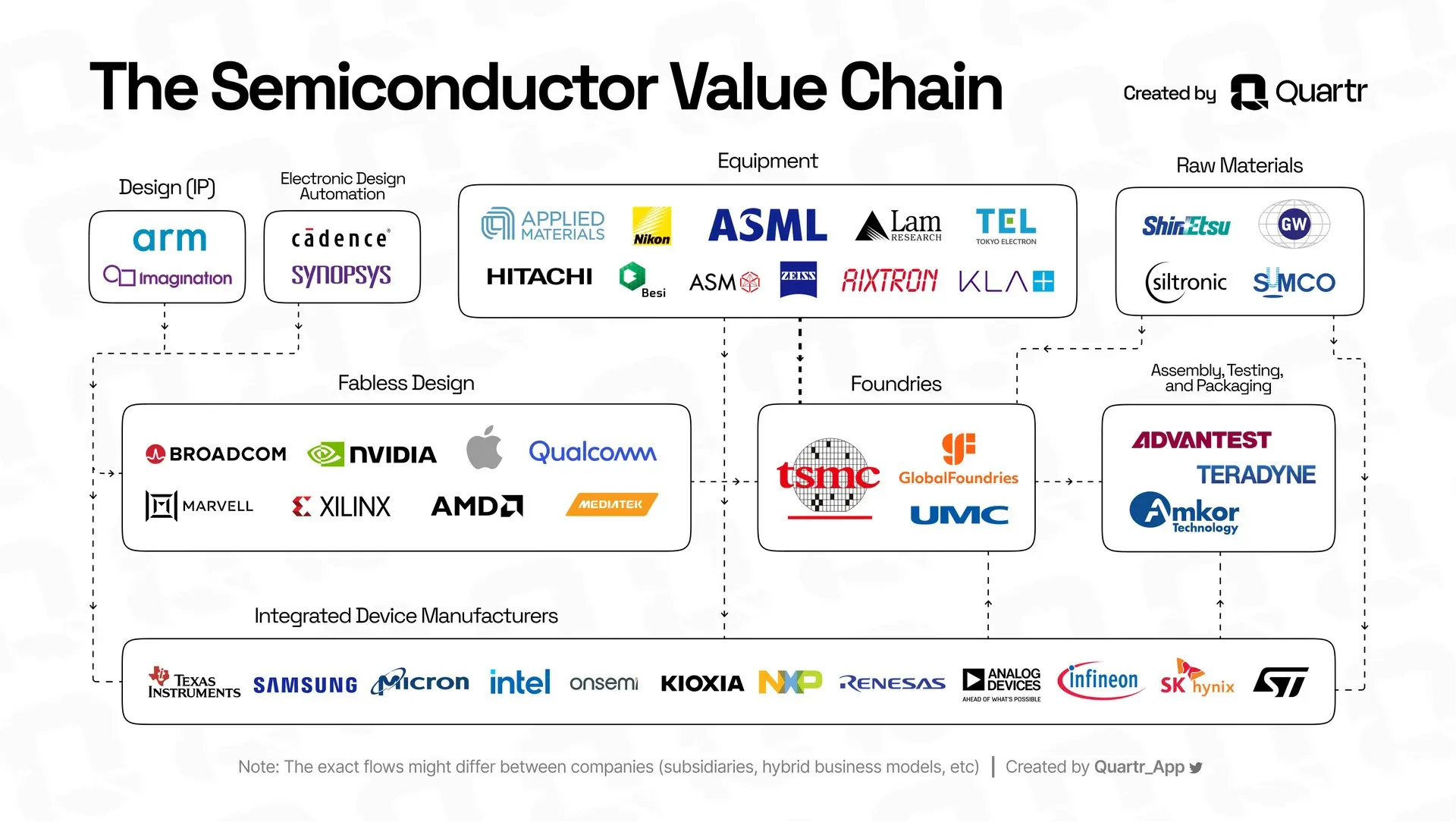 Quartr has created a visual map of the semiconductor value chain, highlighting key players at each stage. This chain is essential for producing efficient, innovative, and functional semiconductor devices. Let's explore each segment and its role in the semiconductor ecosystem.