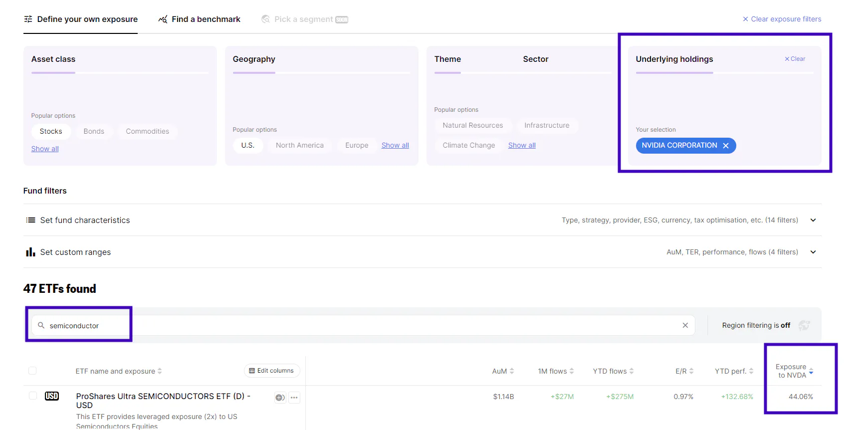 Investors looking for semiconductor ETFs with varying levels of exposure to Nvidia or other specific stocks can easily use our screener with its holdings filter. For instance, by entering 'NVDA' in the underlying holdings section, you can immediately view Nvidia's exposure in the table below, sorted by highest or lowest as needed.