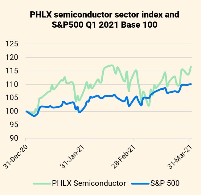 Investors who anticipated those tensions placed a winning bet on the rise of the semiconductor prices. Semiconductor indices had a 16.7% return over the first quarter. In comparison, the S&P 500 index returned just 10% over the same period.