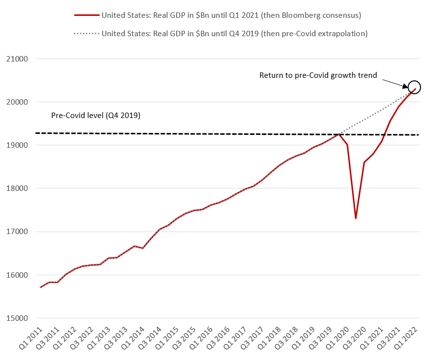 The U.S. economy should benefit from a near-total easing of health restrictions by mid-July, while new checks to families with at least one child are expected at the same time. In the meantime, a likely rebound in international mobility (thanks to the vaccine passport) and the forced savings accumulated since March 2020 (potentially 15/20% of excess savings[1]) should support activity. Thus, the U.S. economy is expected to return to its pre-crisis real GDP by Q2 2021 and return to its pre-Covid growth trajectory by Q1 2022.