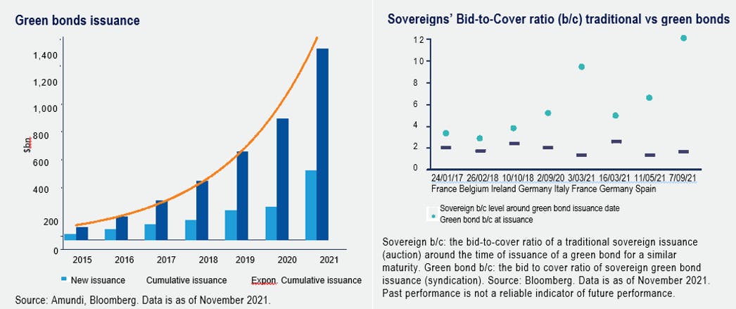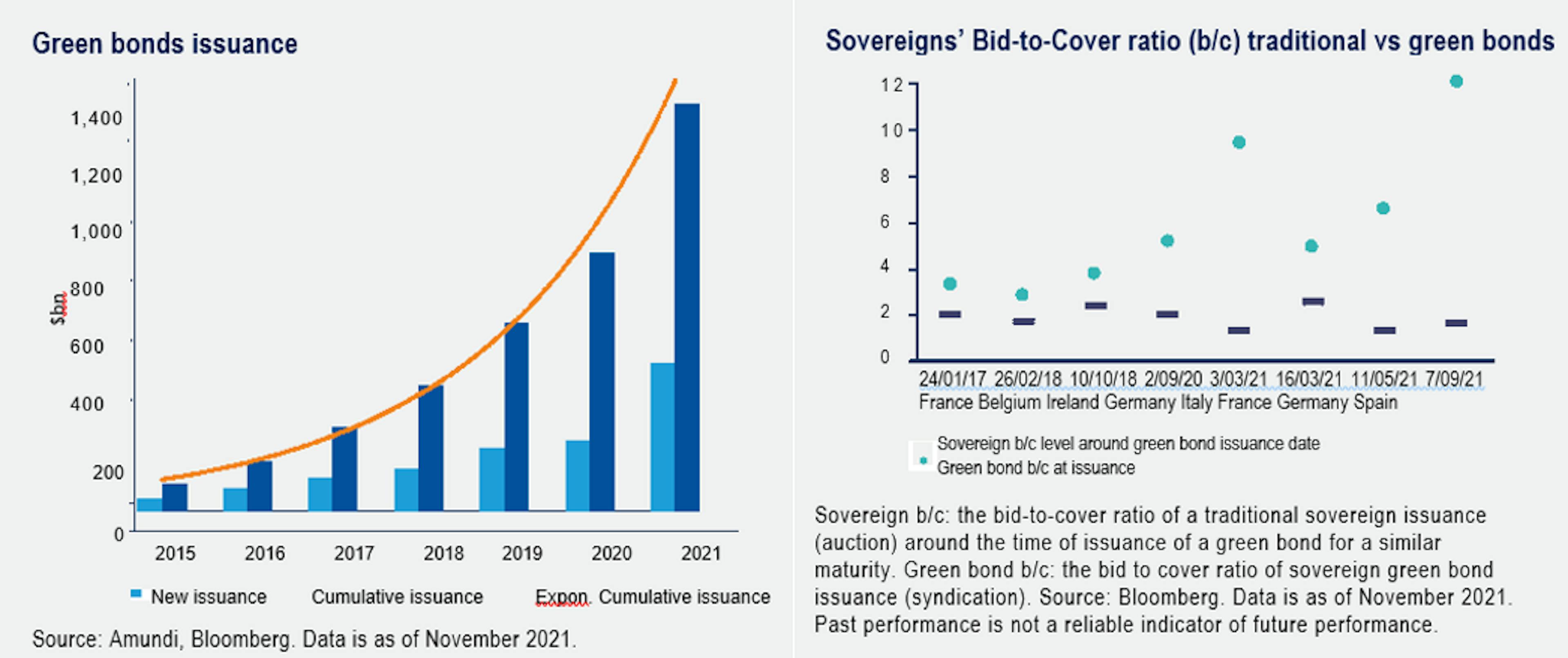 Many sovereigns issued their first green bonds in 2021. The EU’s €12 billion inaugural issue in early October 2021 was the largest single issuance on record. Looking ahead, the EU is firmly on course to become the biggest global green bond issuer, with over €250 billion of issuance expected over the next five years. This represents about 30% of the funds allocated to the EU’s €800 billion ‘NextGenerationEU’ recovery fund launched in the wake of the pandemic.