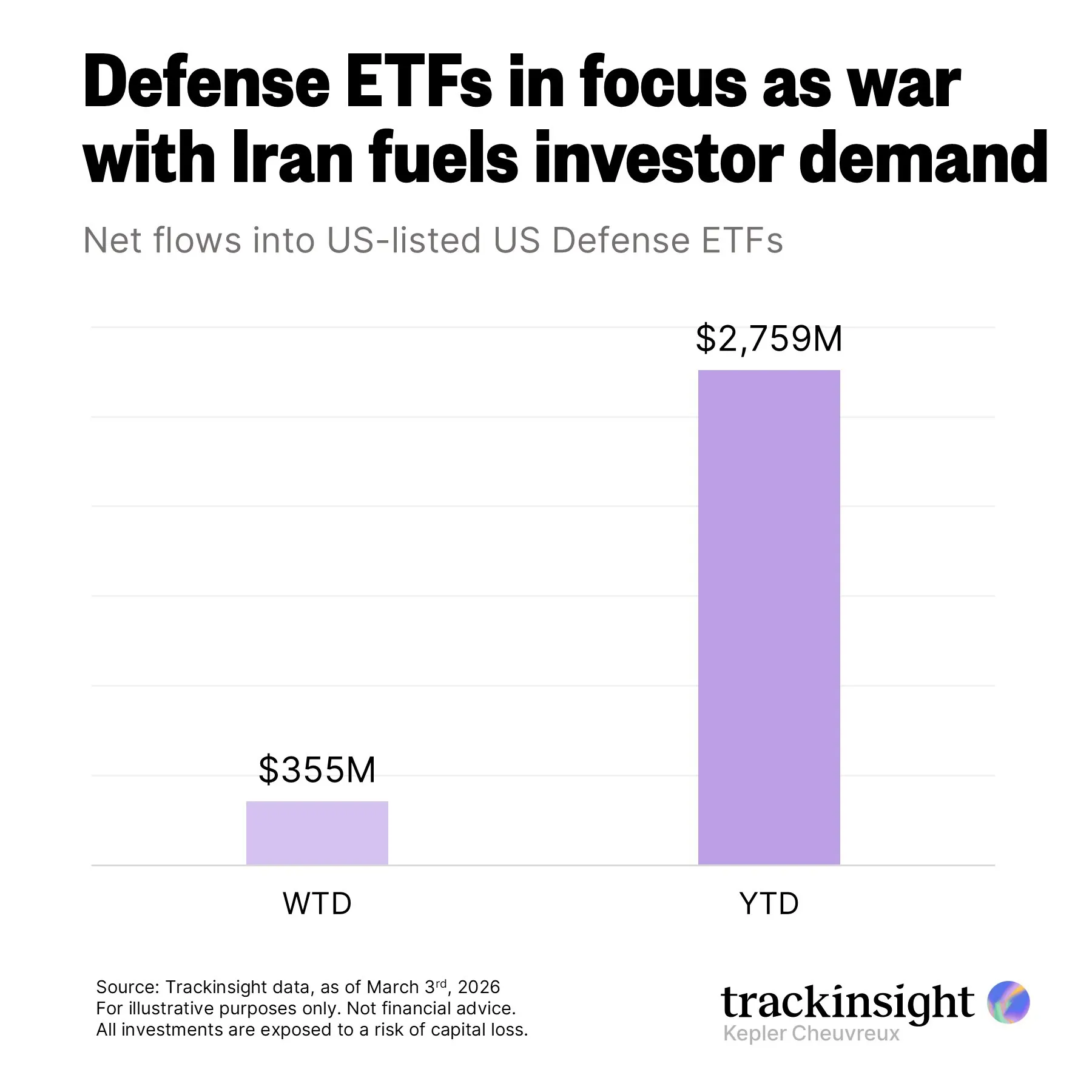 Net inflows into U.S.-listed defense ETFs have exceeded $355M so far this week (as of Mar. 3) following the outbreak of war involving the U.S., Israel, and Iran, bringing total year-to-date inflows to $2.76B.