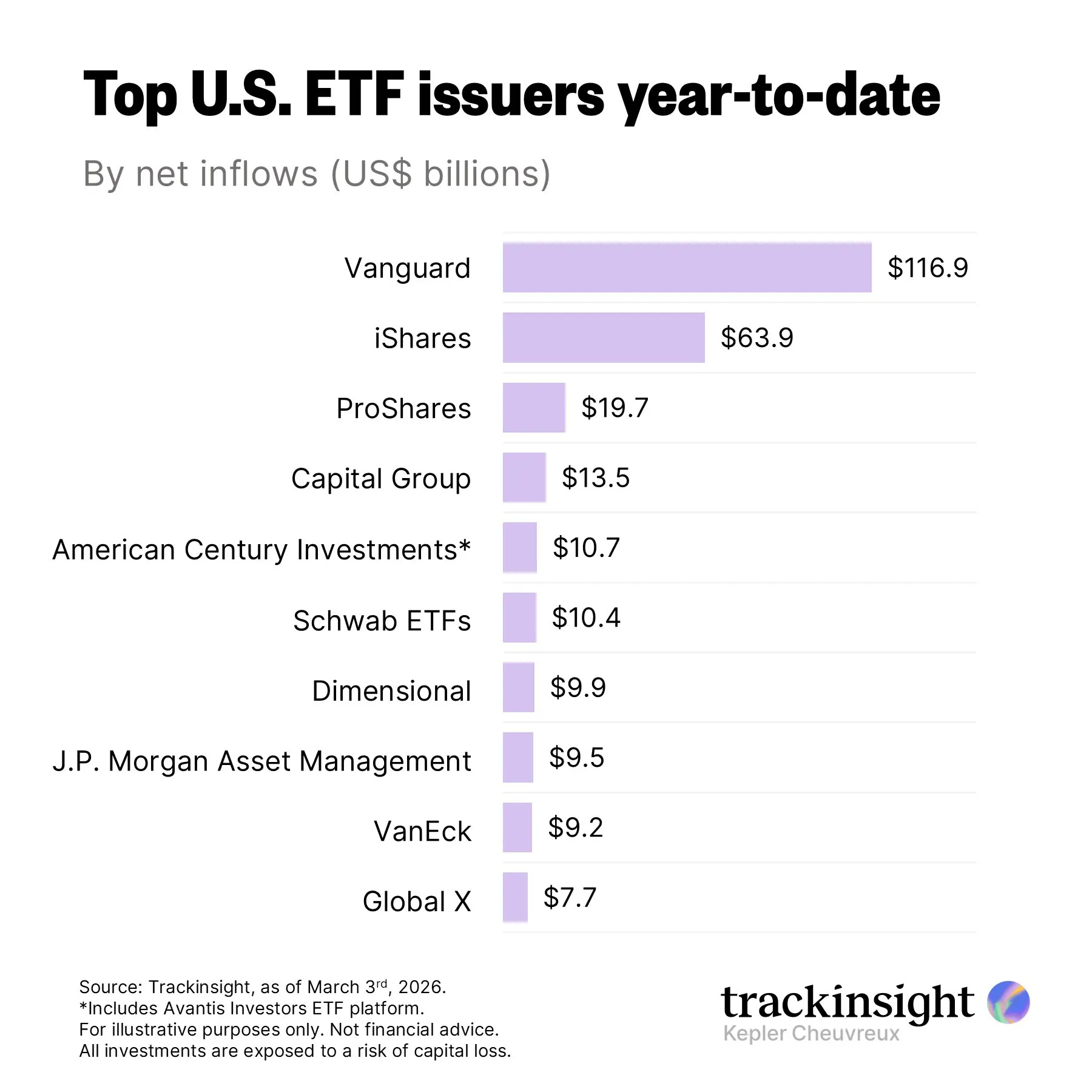 On the issuer side, Vanguard leads the inflow rankings by a wide margin, pulling in nearly twice the flows of iShares, which sits in second place.