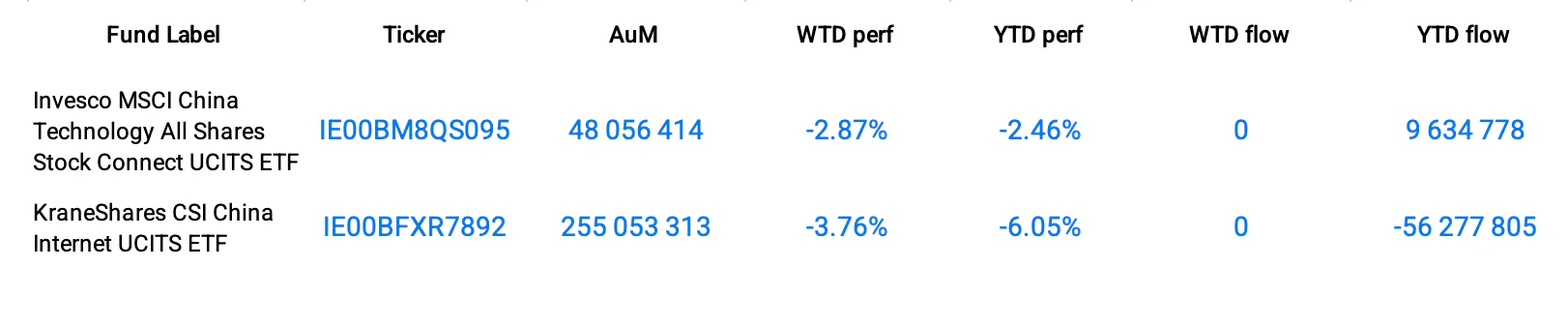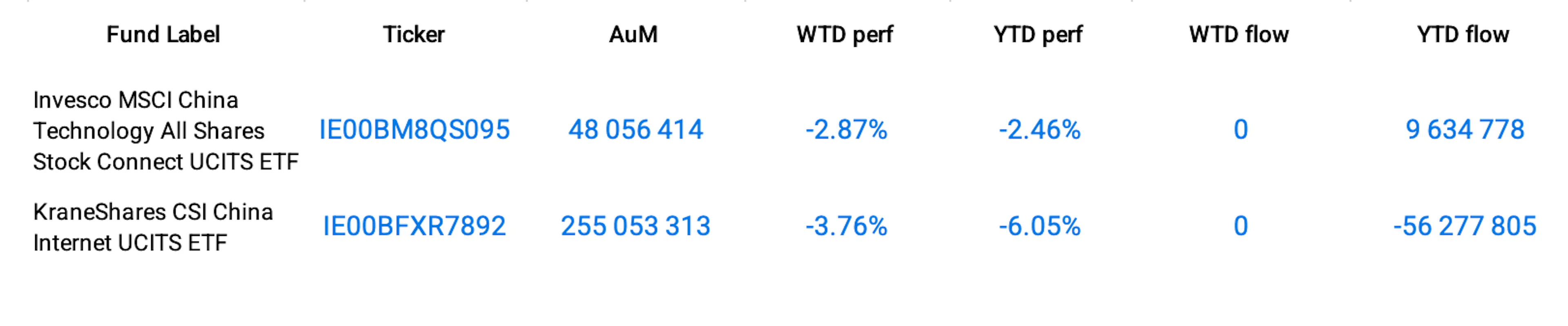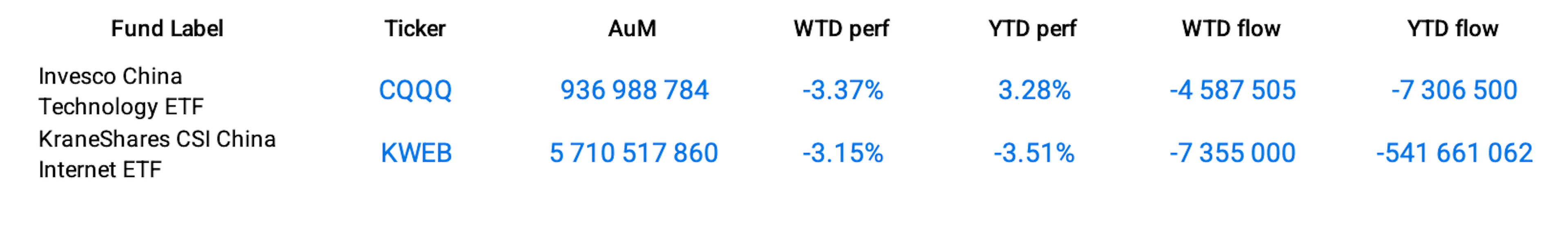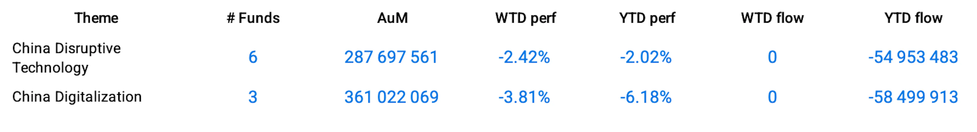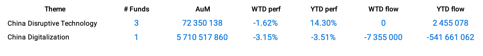 Investors responded swiftly by selling off shares in Chinese tech companies, causing a slump in the market. The Invesco China Technology ETFand the KraneShares CSI China Internet ETF were among the biggest losers, dropping 3.37% and 3.15% respectively over the week. As a result, China Tech-related themes such as China Disruptive technology ETFs (-1.615% WTD) and China Digitalization ETFs (-3.152%) took a nosedive.