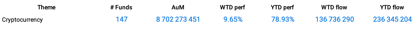 This week, the ProShares Bitcoin Strategy ETF (BITO) gained 8.348%, while the ETC Group Physical Bitcoin (DE000A27Z304) earned 8.813%. Overall, crypto-related ETFs earned 9.651% week to date.