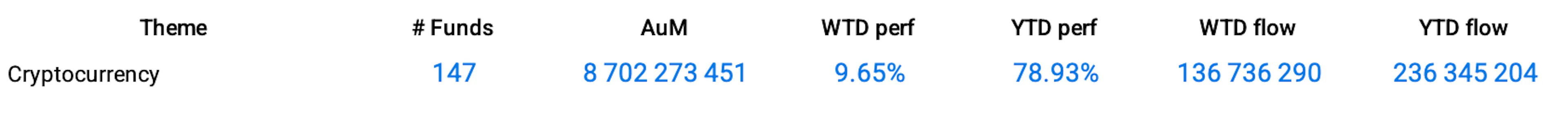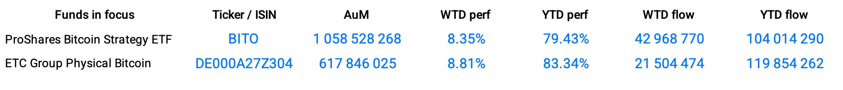 Crypto bull market roars on, Bitcoin up 110.25% YTD. ProShares Bitcoin Strategy ETF up 8.348% WTD, ETC Group Physical Bitcoin up 8.813%.