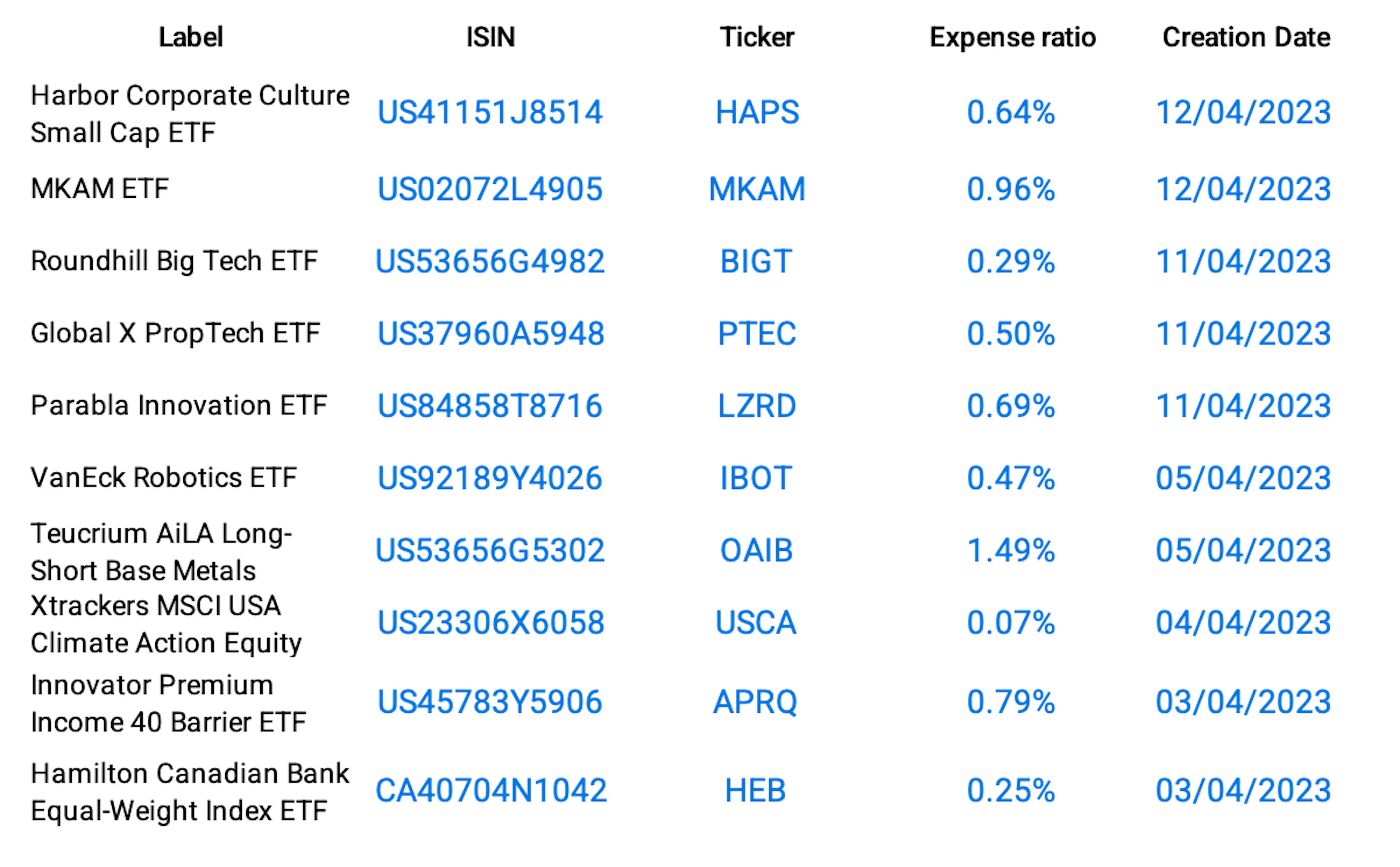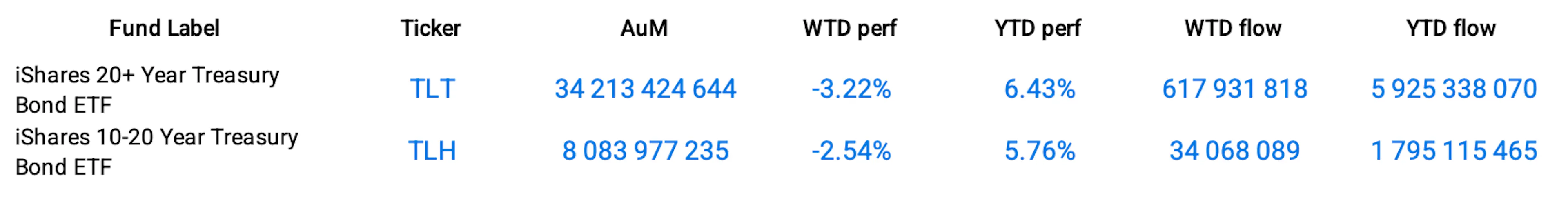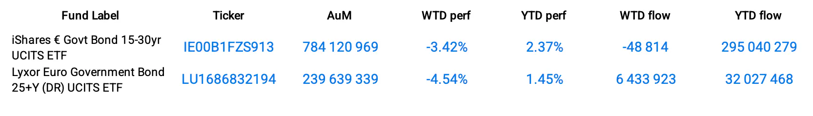 Investors showed a preference for long duration government bond ETFs this week, with significant net inflows recorded despite rising yields. Yields on the 10-year US Treasury note rose from 3.29% to 3.51% (+22.5 basis points) since April 6th. In Europe, the yield on the 10-year German Bund jumped 25.1 basis points from 2.181% to 2.432% over the same period.