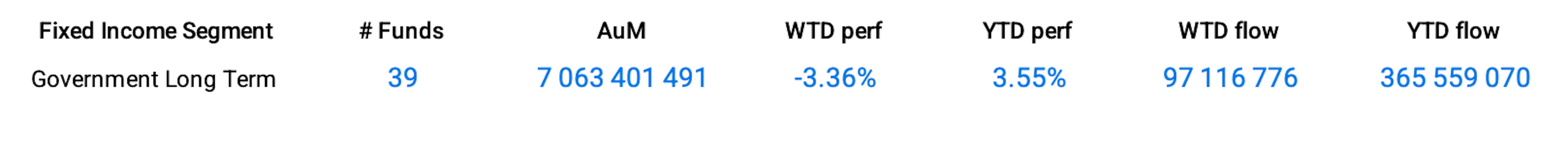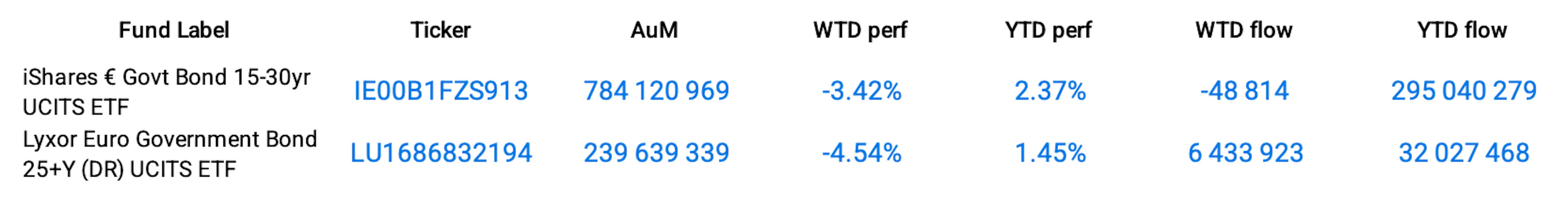 And it’s a similar story in Europe where the iShares € Govt Bond 15-30yr UCITS ETF and the Lyxor Euro Government Bond 25+Y (DR) UCITS ETF shed 4.54% and 3.42% respectively. Euro government bond long-term maturity ETFs had net inflows of €97 million but lost 3.358%.
