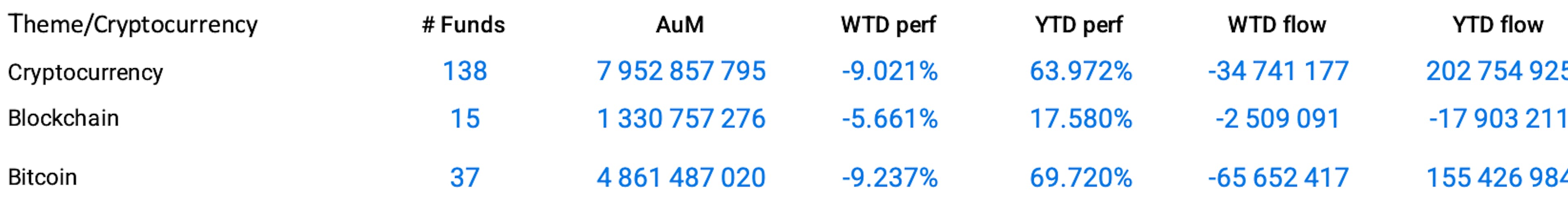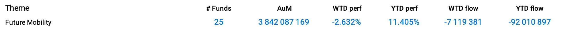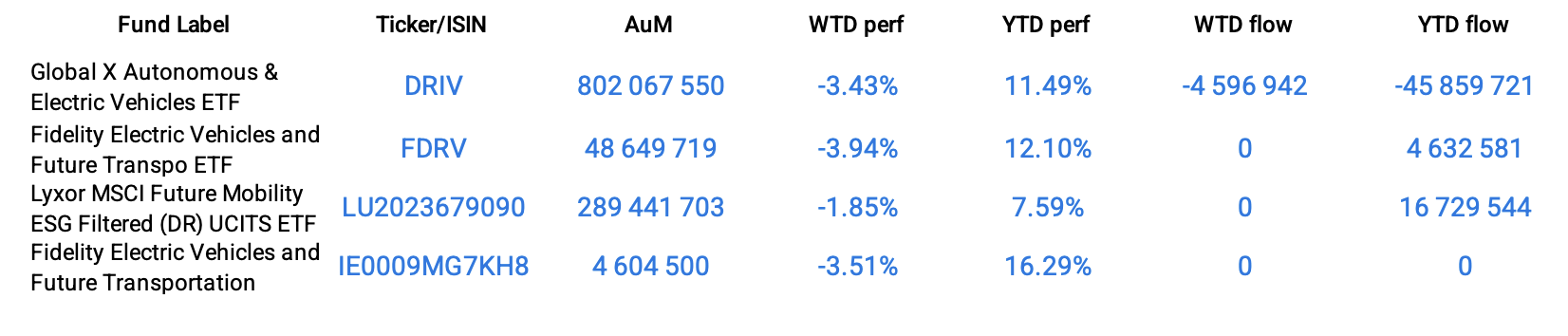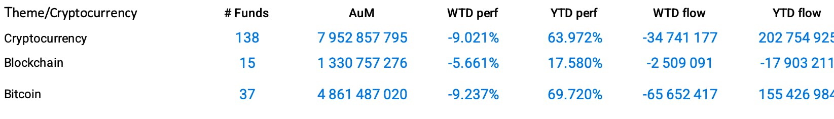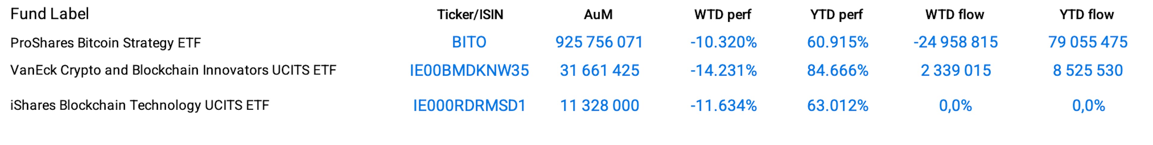 In the crypto space, Bitcoin is globally tracked by 37 funds managing $4.8 Billion. Most of them registered double-digit losses week-over-week: -10.32% for the ProShares Bitcoin Strategy ETF (BITO), -11.63% for the iShares Blockchain Technology UCITS ETF (IE000RDRMSD1) and -14.23% for the VanEck Crypto and Blockchain Innovators UCITS ETF (IE00BMDKNW35).