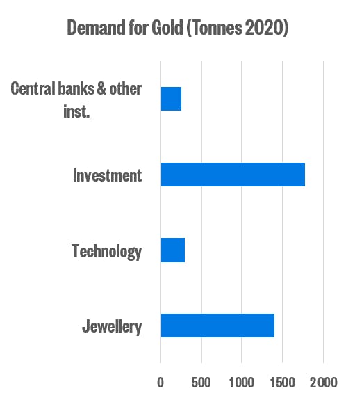 While the jewelry industry is one of the largest sources of demand, accounting for about 1,400 tonnes of gold a year, gold’s increasing popularity as an investment vehicle saw the investment industry account for a record 1,770 tonnes of gold demand in 2020.