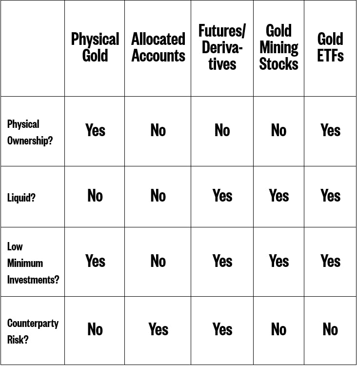 If you want to own gold, there are many ways to do it, each with their own advantages and disadvantages.