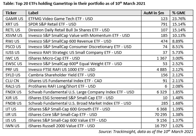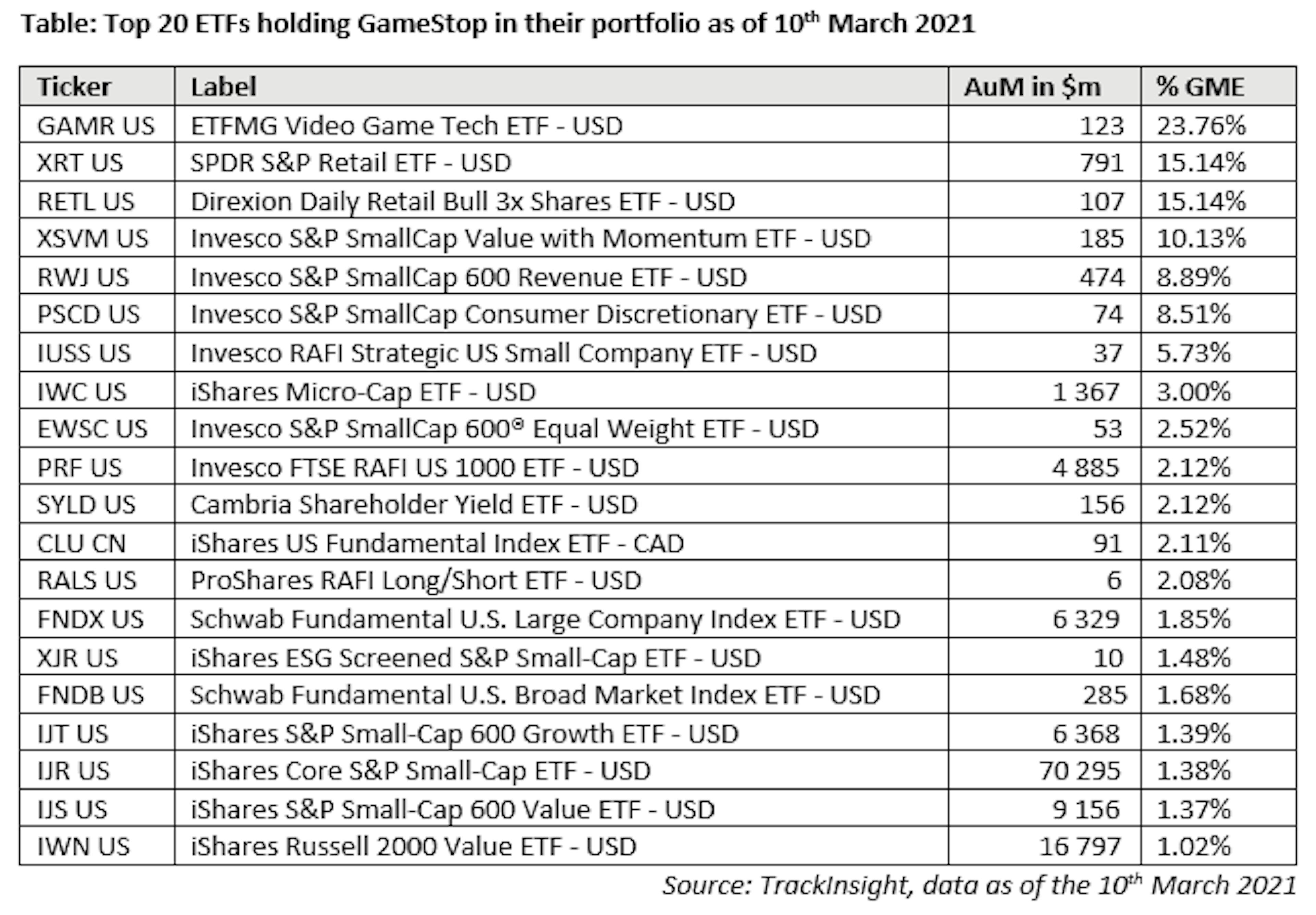 The ETFMG Video Game Tech ETF - GAMR US is the ETF with the largest allocation to GME: 23.76% as of the 10th of March. The ETF is up almost 24% year-to-date.