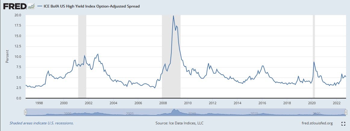High-yield bond spreads are on the rise again. From the start of 2022 to the present, the ICE BofA US High Yield Index Option-Adjusted Spread increased from 3.05% to a high of 5.99% on July 6th, 2022, before settling down at 5.12% on October 4th.