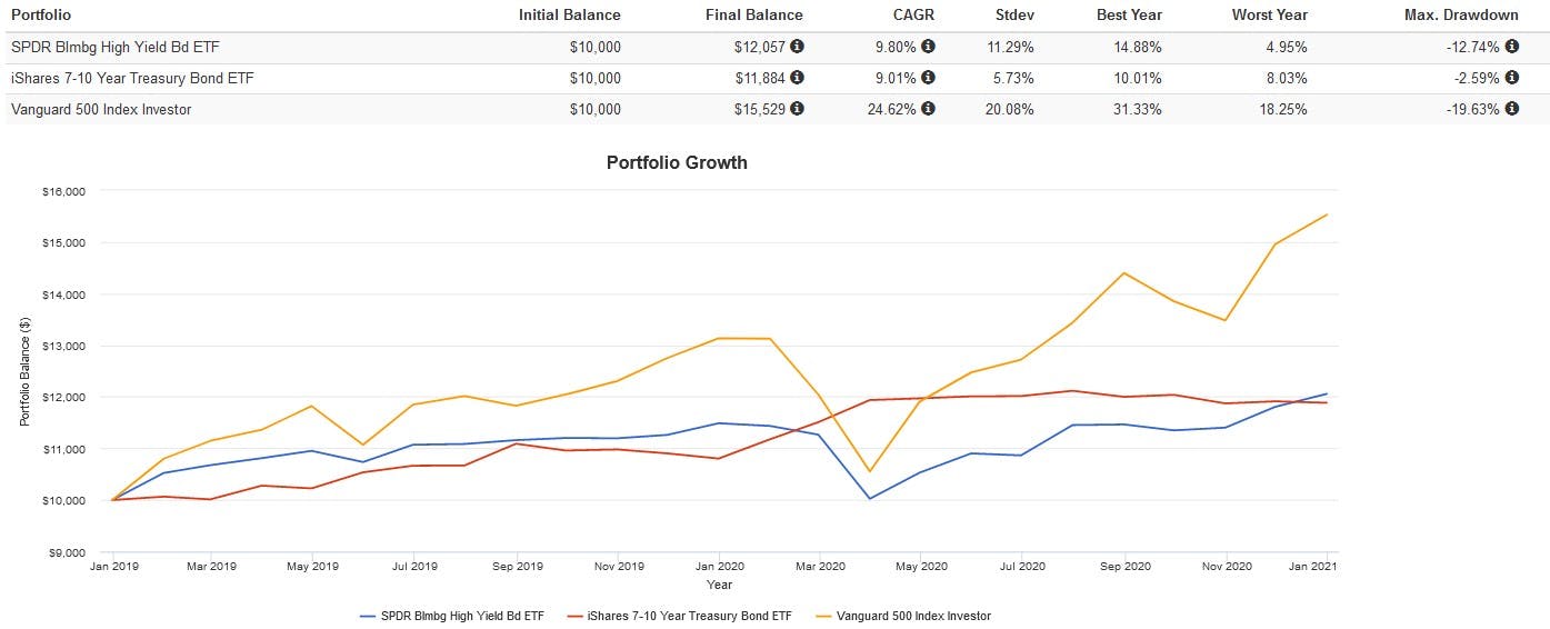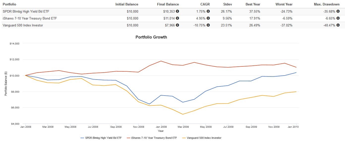 The downside to junk bonds is their greater default risk. This is primarily expressed in terms of a higher correlation with equities. For example, from 2008 – present IEF had a -0.18 correlation with the S&P 500, which made it an excellent diversifier and hedge against market corrections.