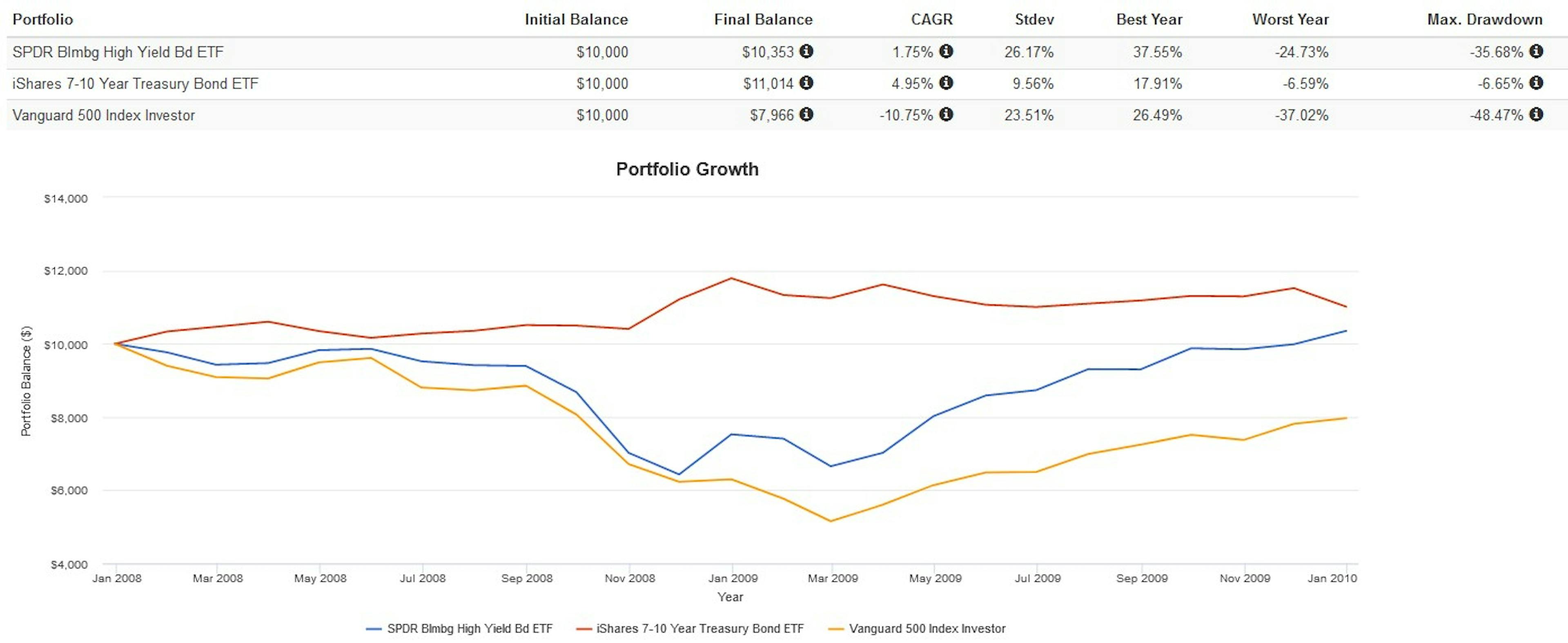 Compare this to JNK, which had a much higher 0.66 correlation with the S&P 500. In 2008 and 2020 when the market crashed, JNK suffered drawdowns of -35.68% and -12.74% respectively, falling nearly as hard as equities did. On the other hand, Treasury bonds like IEF soared.