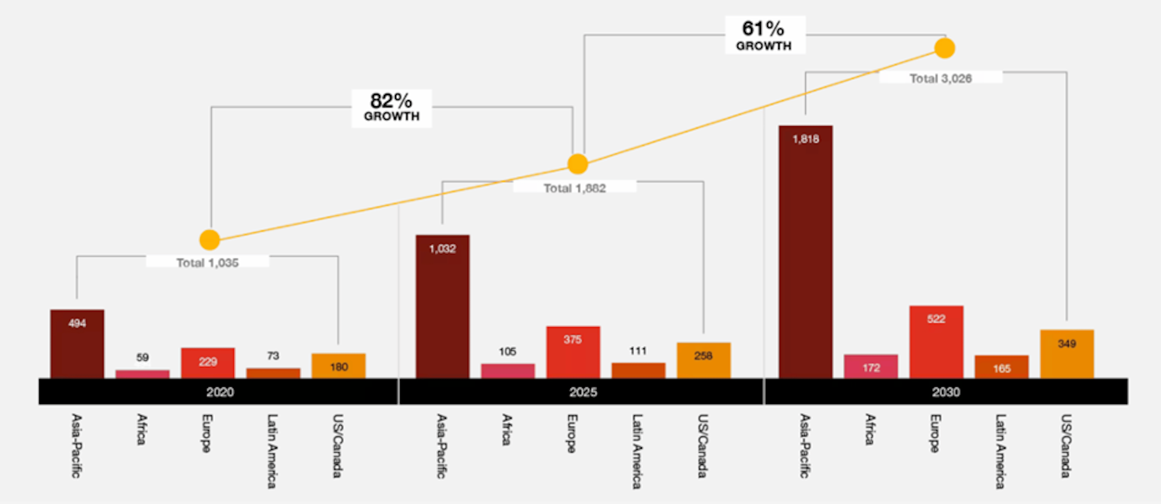 Additional data from PwC projects that cashless transactions will more than double by 2030 with Asia Pacific cashless “transaction volume growing by 109% until 2025 and then by 76% percent from 2025 to 2030, followed by Africa (78%, 64%).”