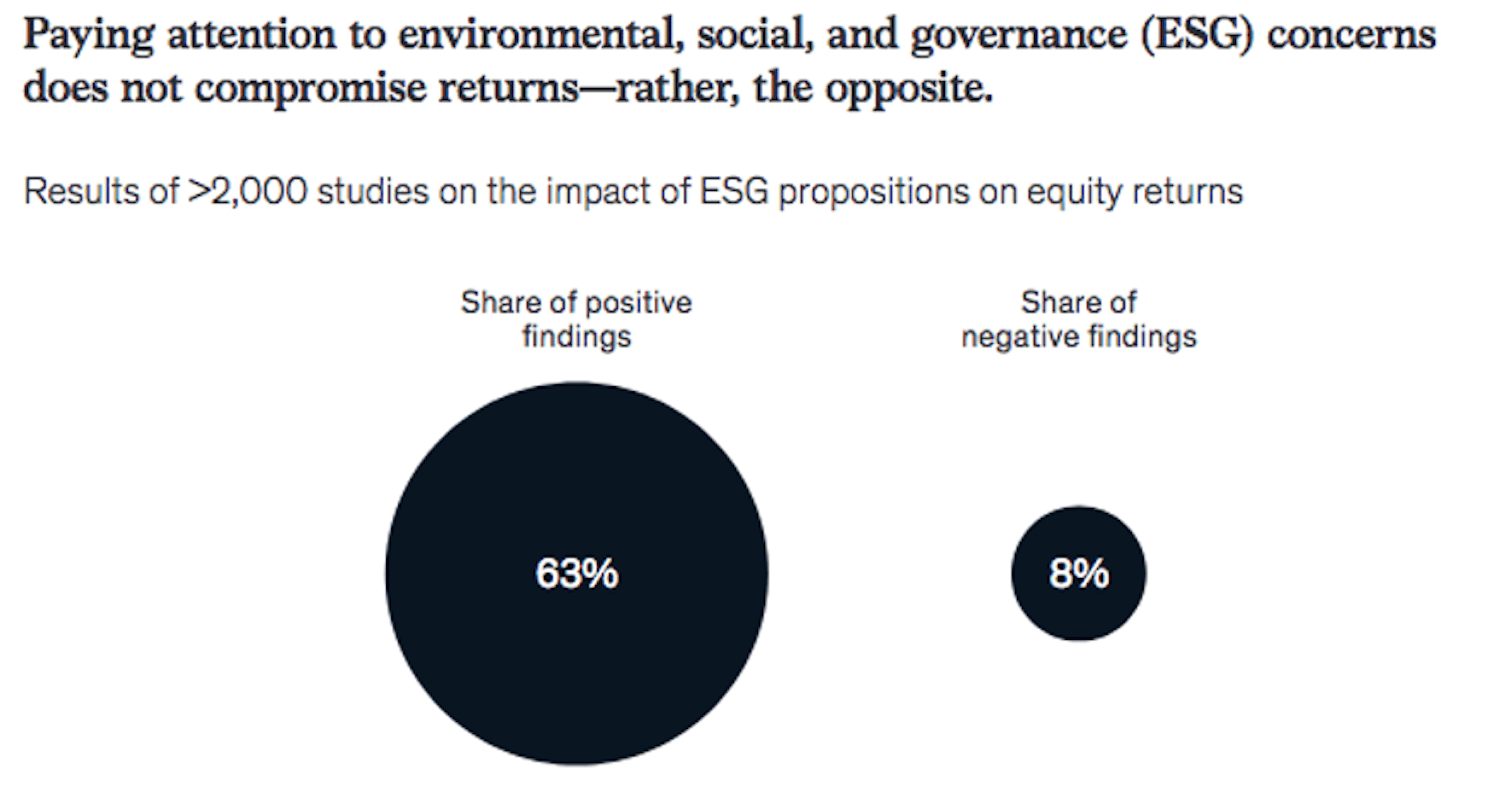 Research from McKinsey expands on the connection between ESG principles and lower risk. They conclude that “better performance in ESG also corresponds with a reduction in downside risk, as evidenced, among other ways, by lower loan and credit default swap spreads and higher credit ratings.”