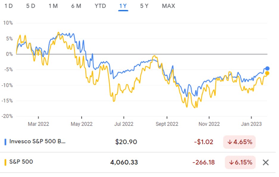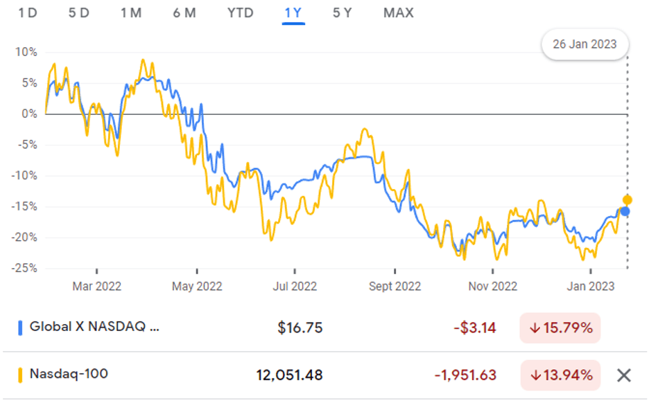 Looking at the two examples below, we see that the Global X Nasdaq 100 Covered Call ETF underperformed the Nasdaq 100 index in 2022, which was undoubtedly a bad year for tech equities, while Invesco’s covered call ETF, the Invesco S&P 500 BuyWrite ETF, outperformed the S&P 500 Index.