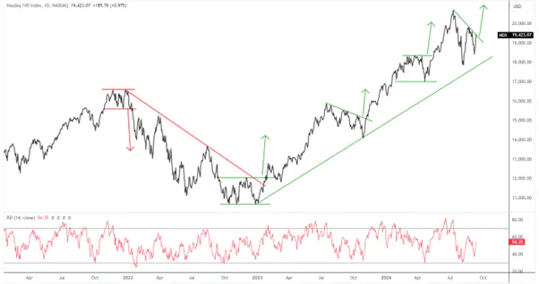 Despite the uncertainty, the Nasdaq 100 index, heavily weighted with tech stocks, is poised to resume its upward trend. A break above the downtrend line from the July 2024 peak appears imminent, potentially leading to an impulsive rally to new record highs in the coming months.