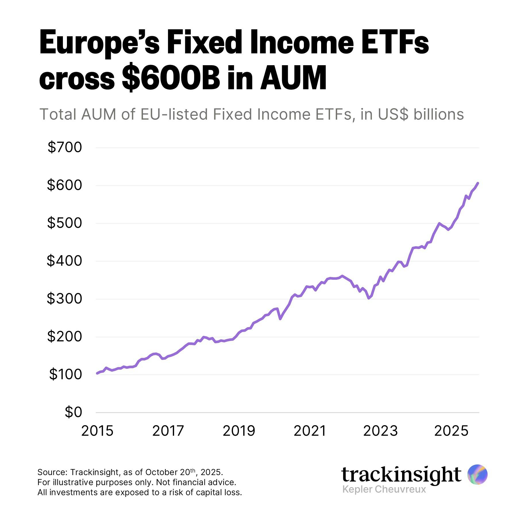 A new milestone for Fixed Income ETFs in Europe as the segment surpasses $600 billion in assets under management after attracting $66 billion in inflows year-to-date, with two thirds directed toward investment-grade government and corporate bond ETFs.