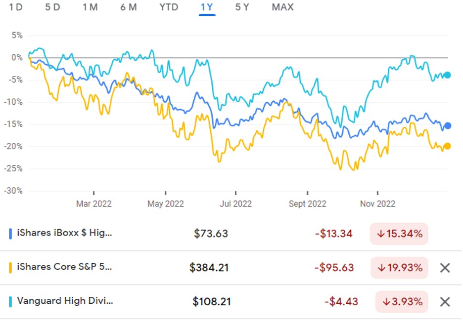 Below, we compare the relative performance of 3 ETFs focusing on High Yield Debt, the core S&P 500 Index, and High Dividend Equities, over the last year: