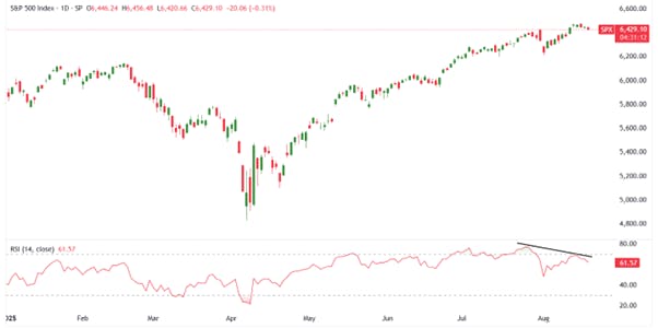 Additionally, technical indicators are flashing early warning signs. The index is overbought, and bearish divergences between price action and the Relative Strength Index (RSI) have emerged. As earnings season winds down, markets are approaching the seasonally weak months of September and October, increasing the probability of a short-term pullback.