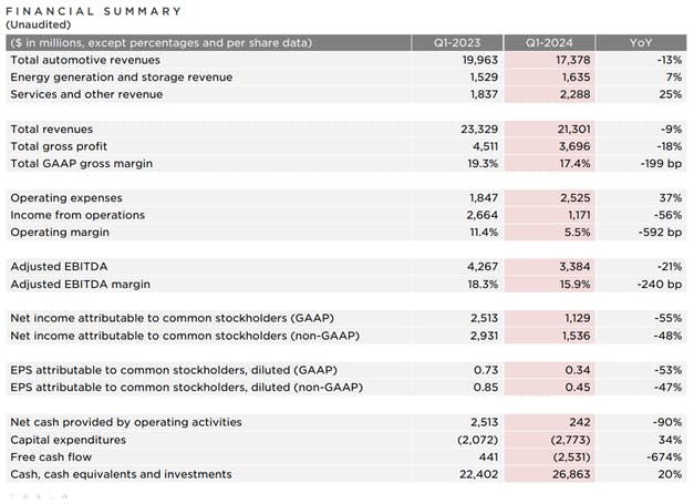 Despite a 37% increase in operating expenses and a 34% increase in capital expenditures, Tesla's adjusted EBITDA (earnings before interest, taxes, depreciation, and amortization) declined by 21%, and earnings per share fell by 55%. This highlights the impact of the intense price competition within the electric vehicle (EV) market, as evidenced by the 18% decrease in gross margin.