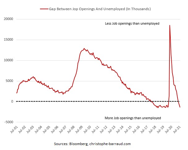 In addition, the labour market is probably much tighter than indicated by the 5.4% unemployment rate. As a matter of fact, the difference between number of job openings and unemployed is nearly 1.4M (taking into account the same number of job openings for July), roughly the same gap seen in September and October 2019, when unemployment rate averaged 3.55%.