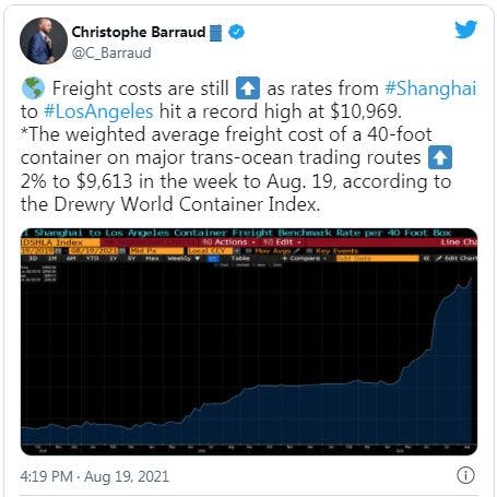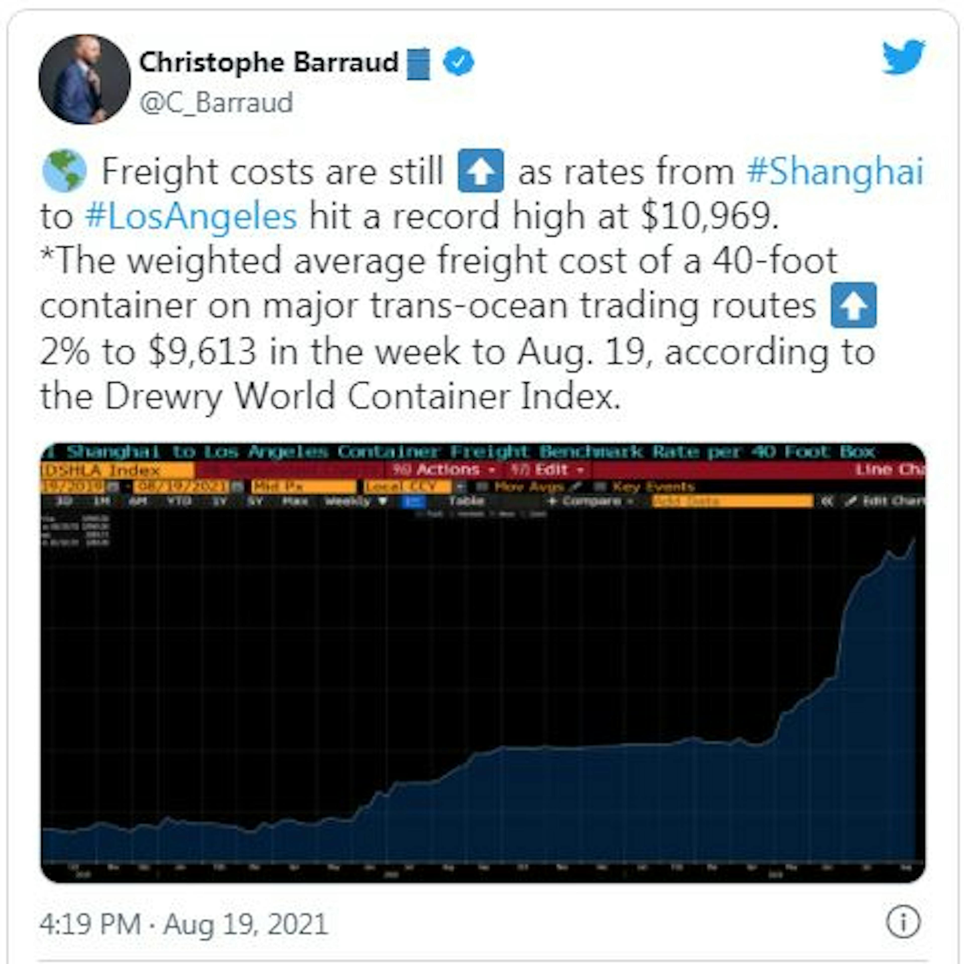 Meanwhile, a big bang has happened in the freight industry, with prices making a new record high every week. Recently, the port of Ningbo-Zhoushan in China was partially shut down, disrupting global trade at a time when businesses are ramping up for the Christmas holiday shopping season.