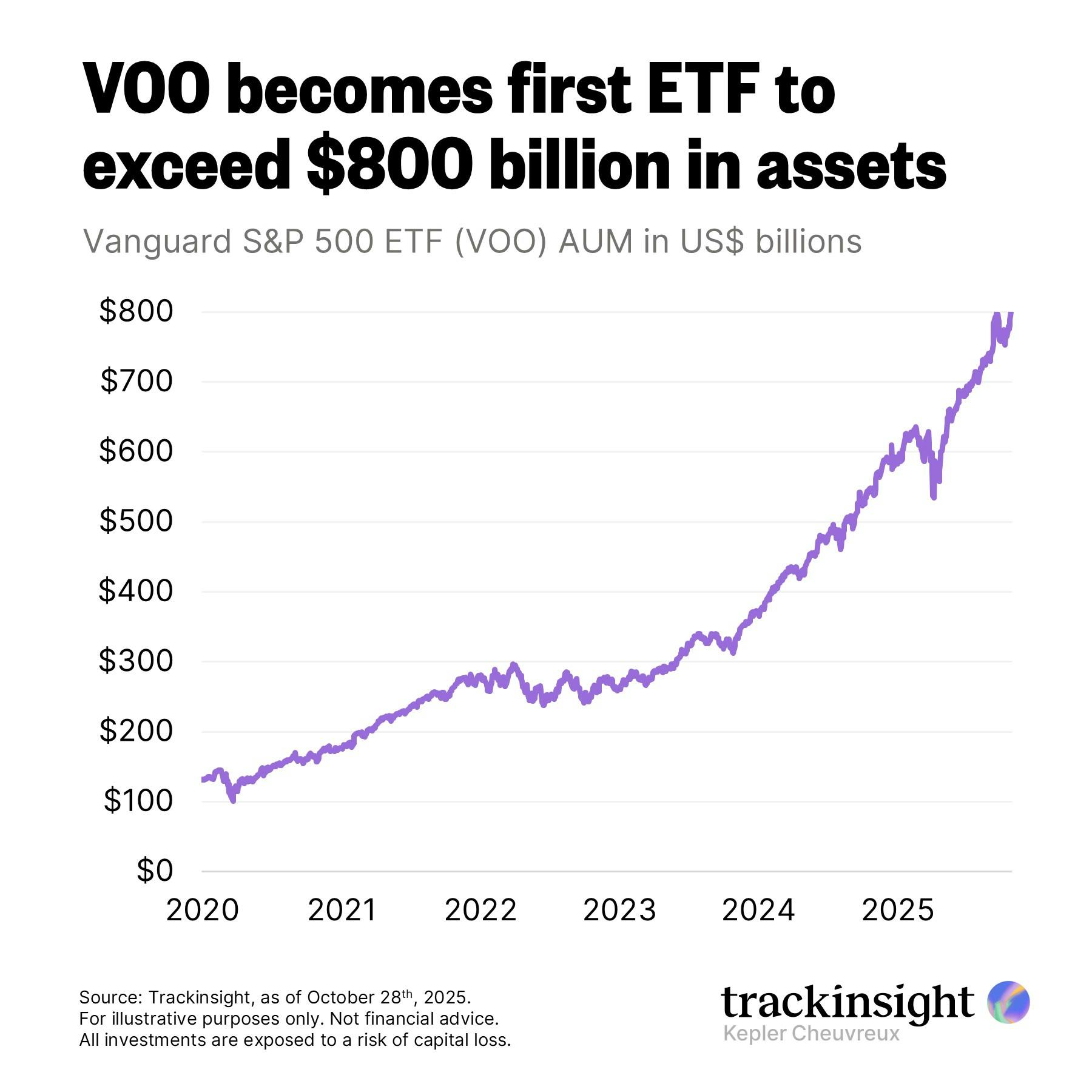 After hitting $700B in assets just last July, Vanguard’s flagship S&P 500 ETF, VOO, has now become the first ETF in history to surpass $800B in AUM — marking another milestone for passive investing.