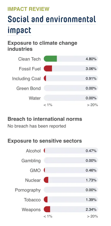 The "impact review" provides a detailed exposure of the ETF portfolio in regard to climate change industries, sensitive sectors and international norms in percentage.