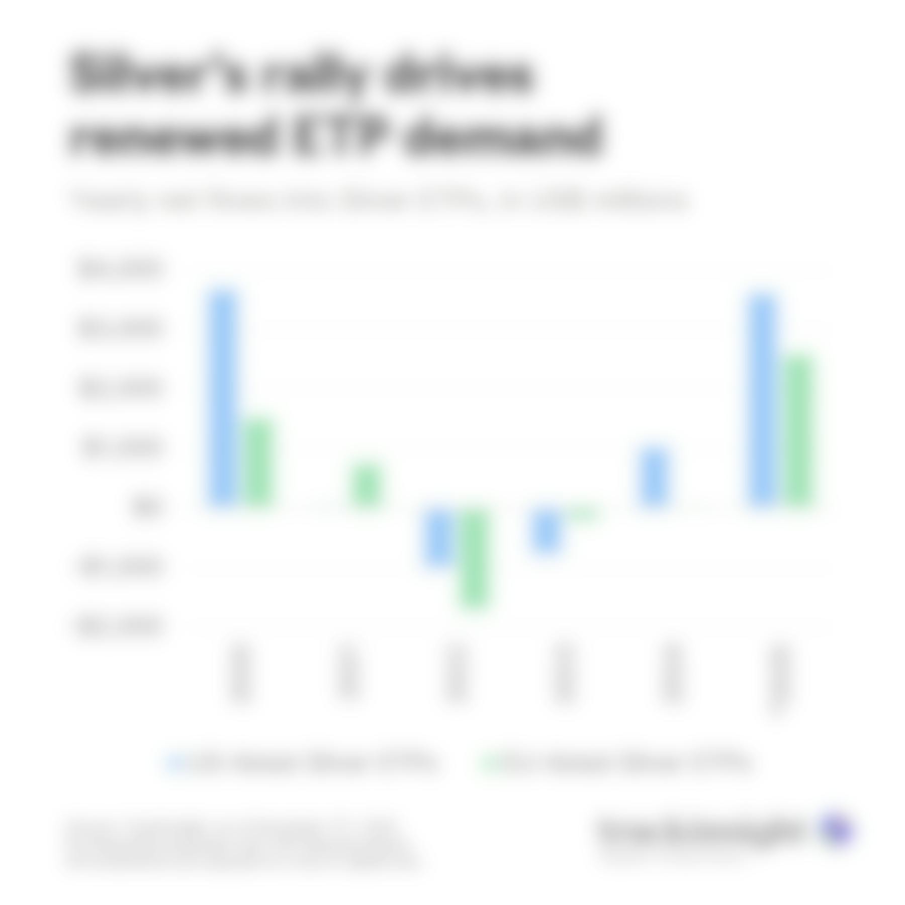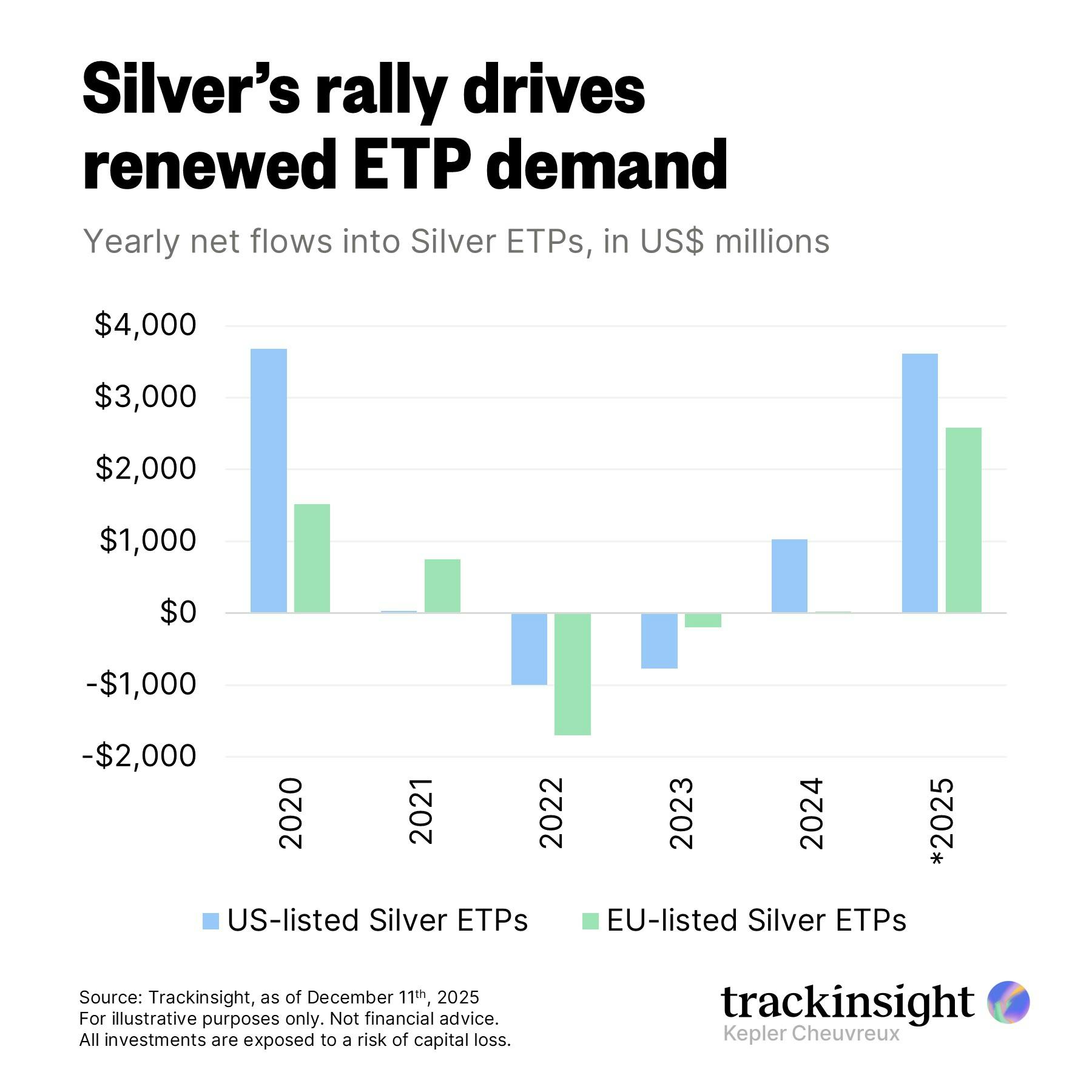 Silver, the gold medalist among metals this year with triple-digit returns, saw ETP inflows surge, reinforcing a powerful positive feedback loop between performance and flows.