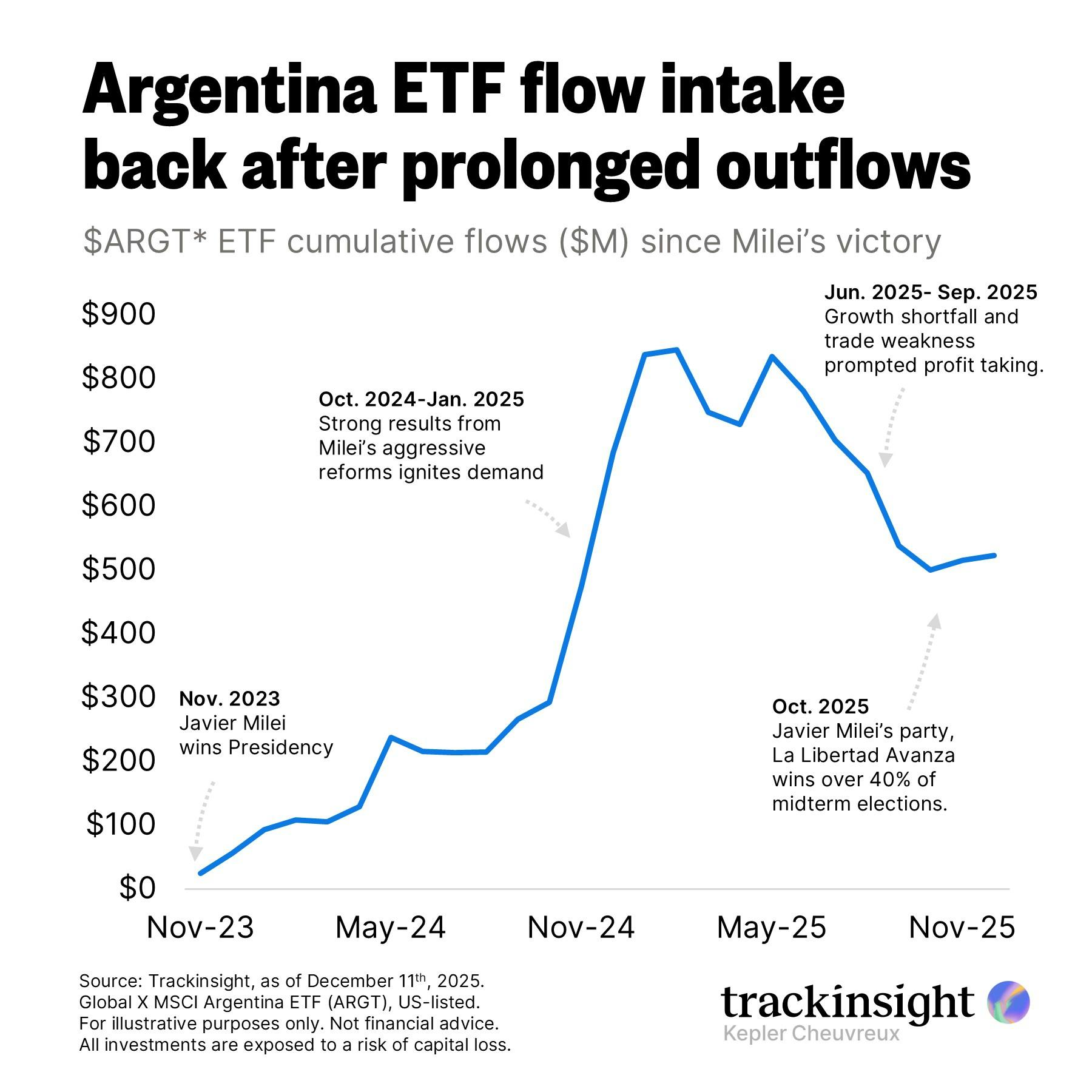 Net monthly inflows have returned to the only U.S.-listed Argentina ETF, the Global X MSCI Argentina ETF (ARGT), with two months of modest positive intake after eight consecutive months of outflows.