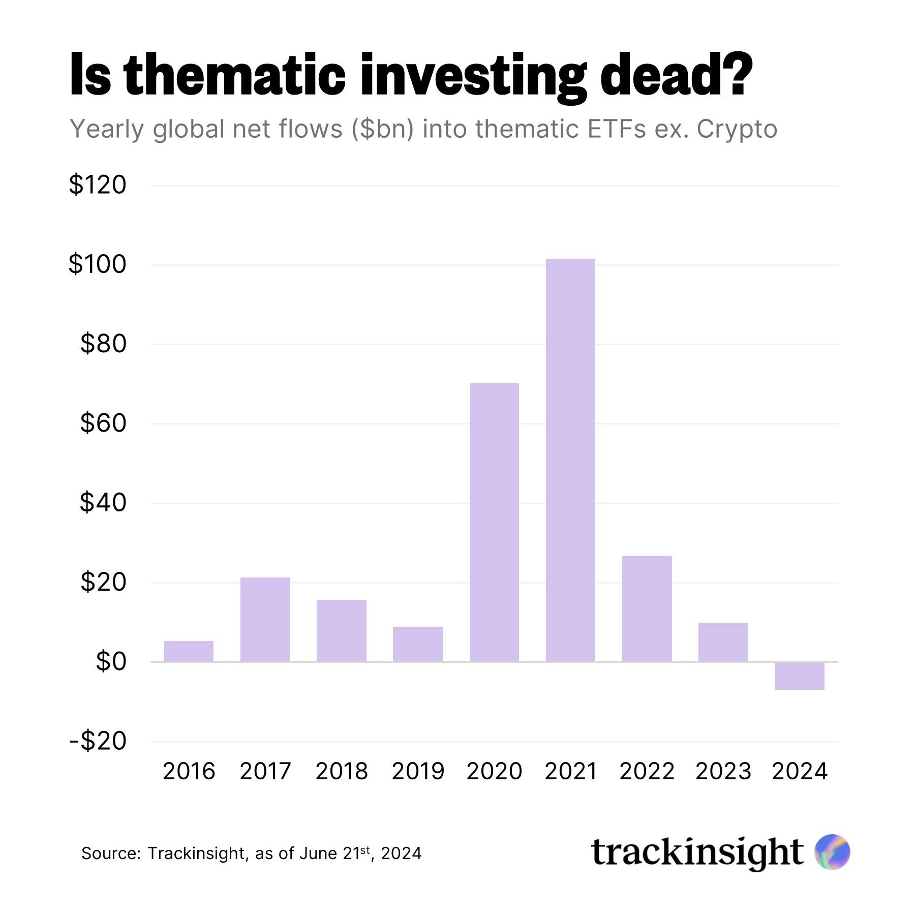 Once the toast of the 2020/2021 investment boom, global thematic ETFs have seen their popularity wane. Despite a rising overall market, assets under management (AUM) have stagnated since late 2023 ($284 billion YTD vs $285 YE 2023). This signals a cooling of investor interest, with net outflows even expected in 2024 (-$7 billion YTD).