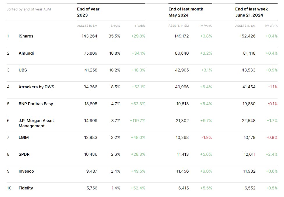 Trackinsight reveals which asset managers are dominating the ESG ETF landscape across the globe. See who's leading the race in Assets Under Management (AUM) and net inflows in Europe.