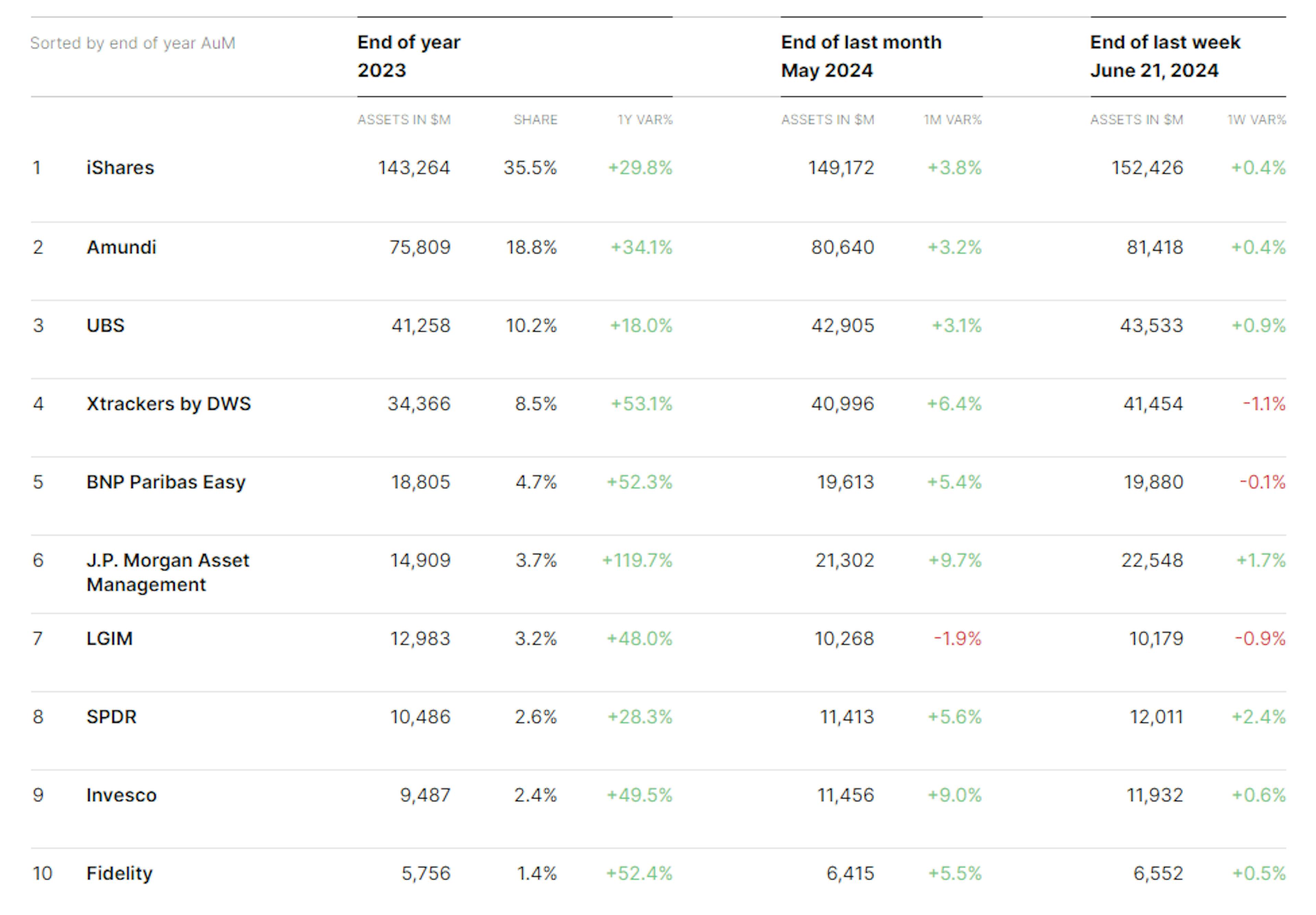 Overall, European ESG ETF flows may be dipping, but active ESG options are popular and represent over a quarter of ESG flows in the region. J.P. Morgan, a leader in active management, holds the largest share of these assets in Europe, solidifying their dominance in the active ESG space in the continent.