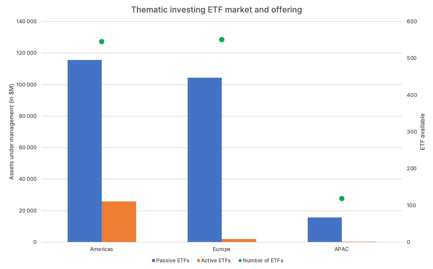 As per the global ETF market, the Americas is leading the way for actively managed thematic strategies, with almost $26 billion of assets under management. In contrast, thematic assets ‘only’ represent $2 billion at present in Europe.